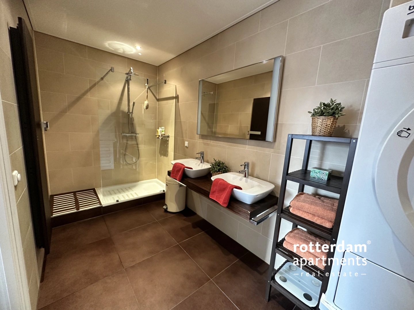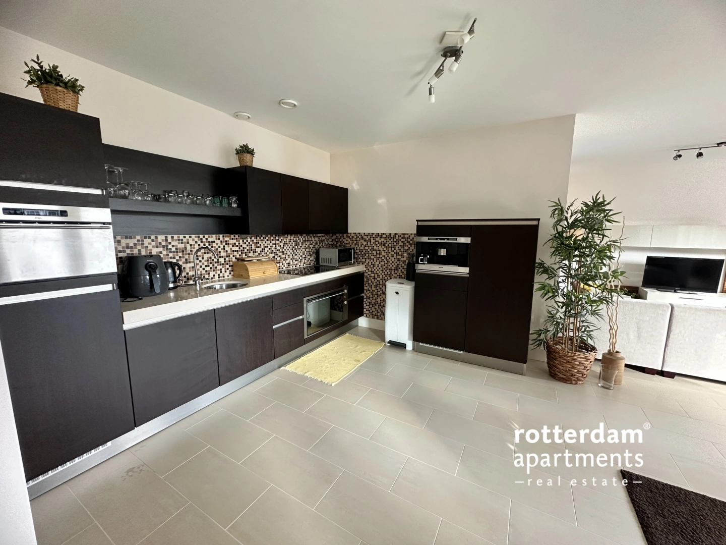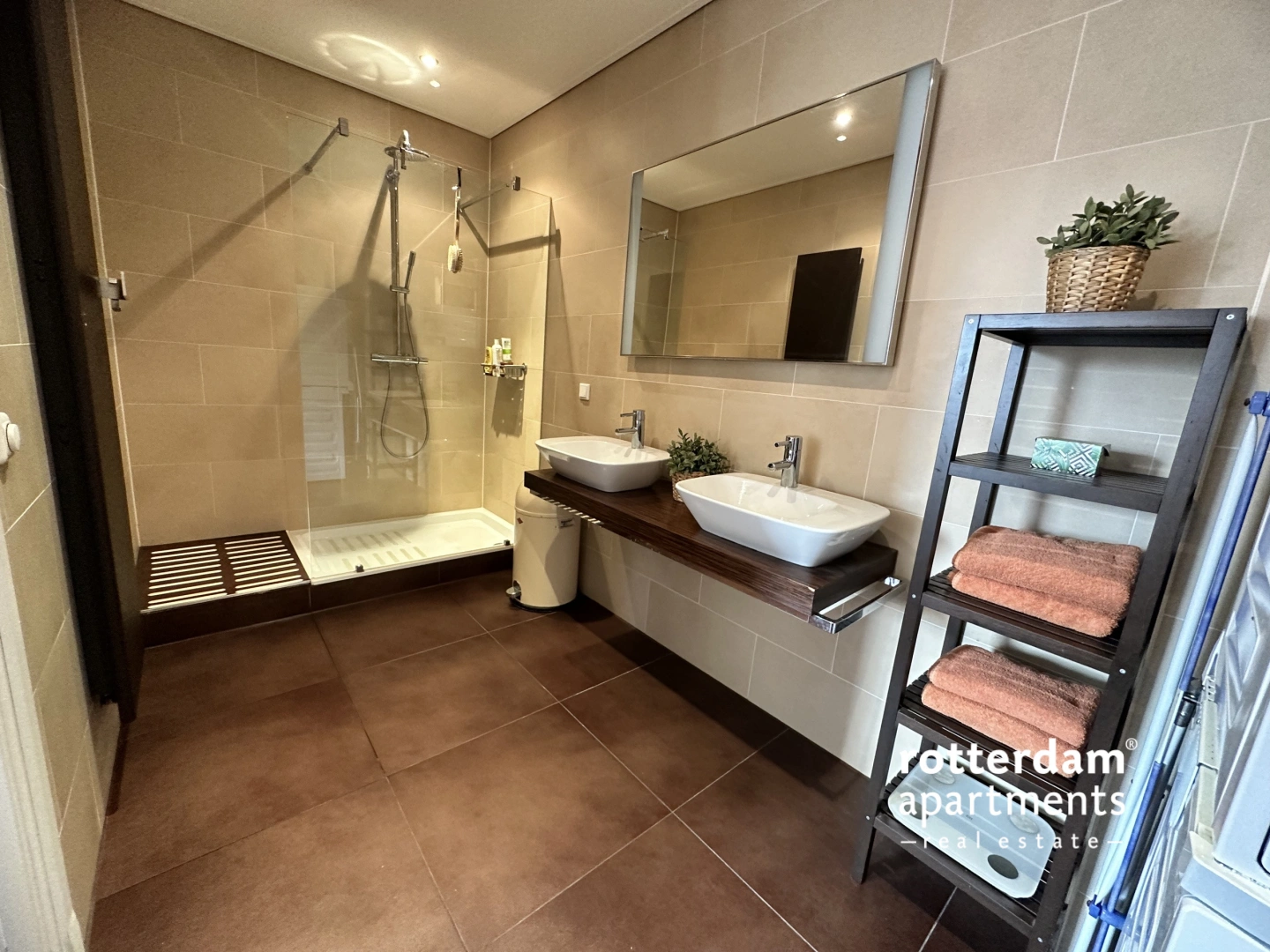 A spacious hall provides access to all rooms, a meter cupboard, storage space, and a toilet. The bright and spacious living room offers fantastic views of the Binnerotte. The modern, dark-colored open-plan kitchen is equipped with a variety of luxury built-in appliances, including an induction cooktop with extractor hood, refrigerator, dishwasher, and Miele coffee machine. The kitchen also offers ample storage space. There are two spacious bedrooms. Bedroom I has a double bed and a large linen closet. From this room, you have access to the spacious bathroom, which features a large walk-in shower, double vanity with a mirror, storage space, a washing machine, and a designer radiator. Bedroom II has two single beds and chests of drawers. Parking lot at €375.00