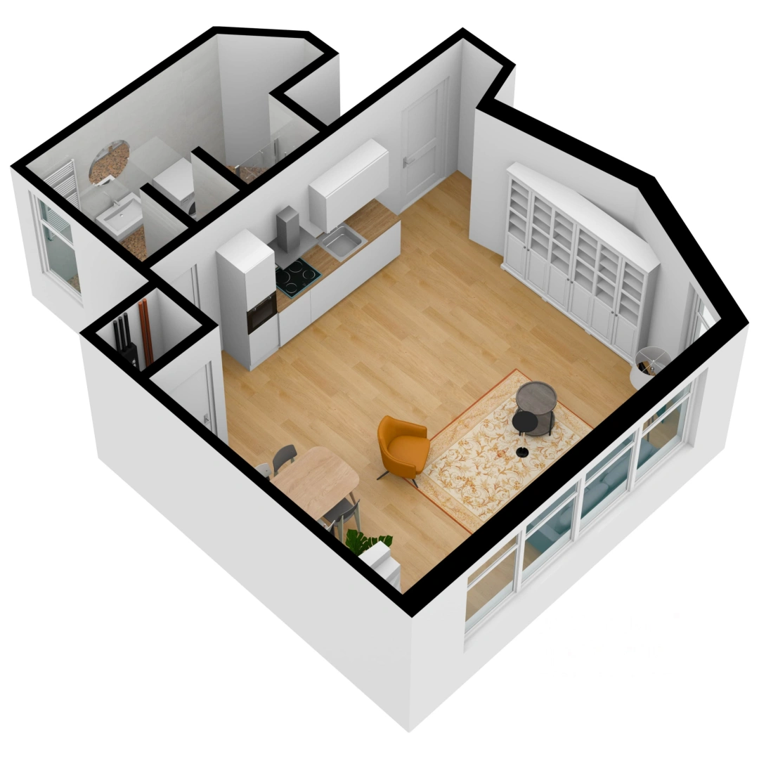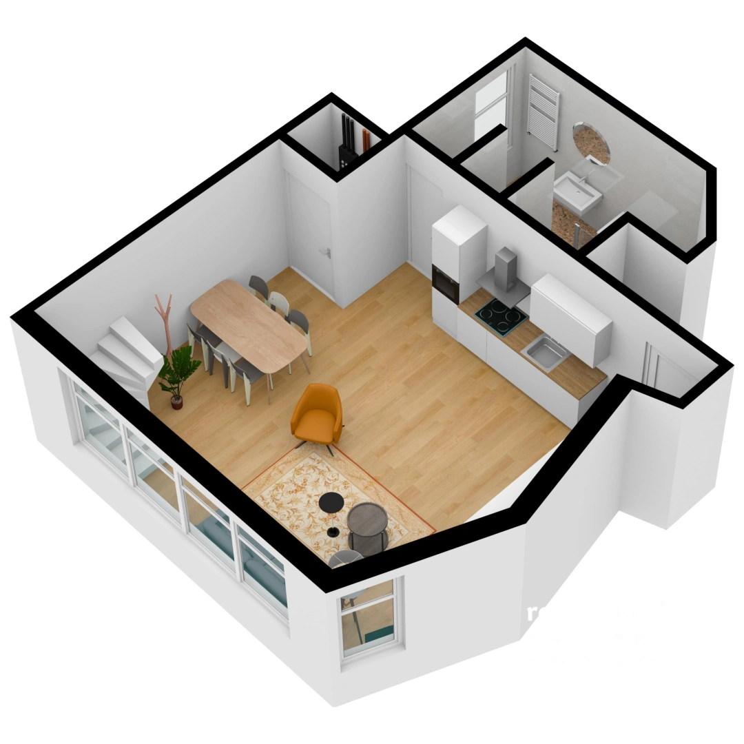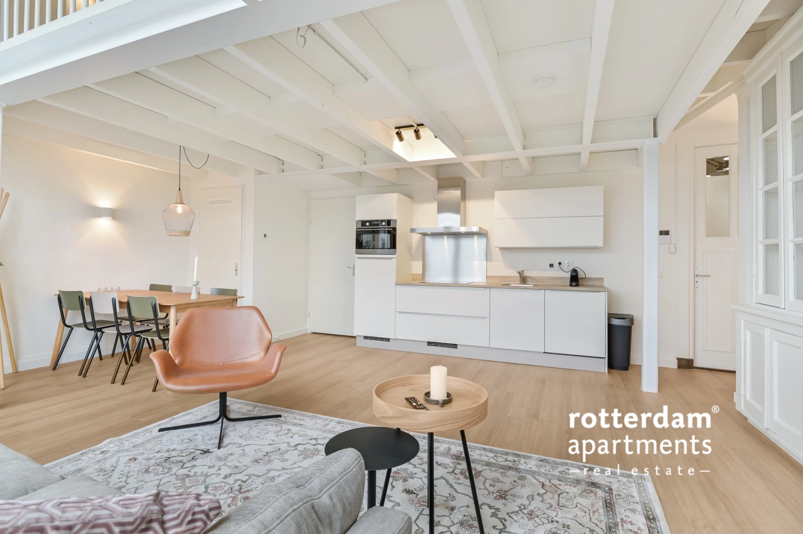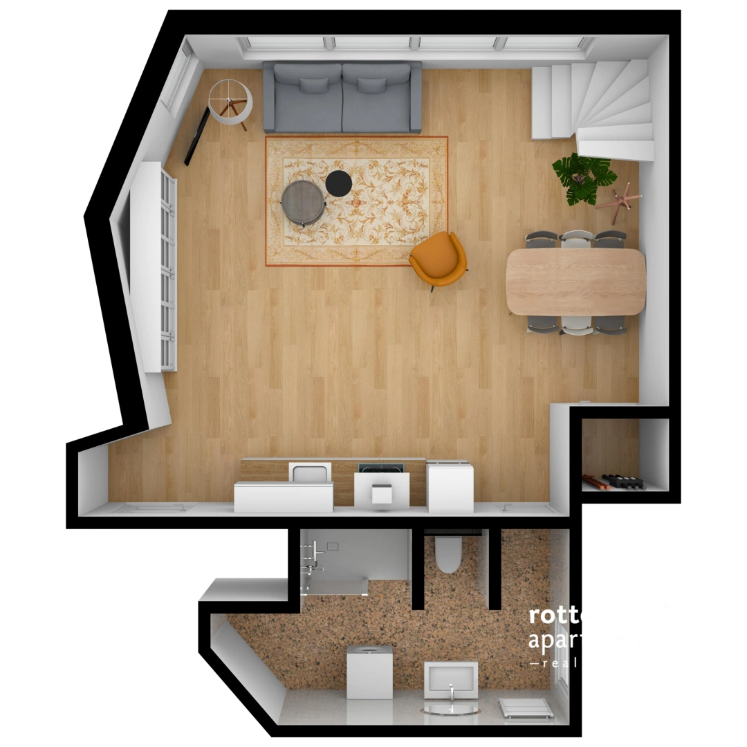 Layout: This apartment is spread over 2 floors, 1st floor and an entresol. Entrance on the 1st floor in the hall, from here access to the bathroom with toilet and storage cupboard with the washing machine dryer. Through the hall access to the living and dining area with completely new kitchen. Access via the spiral staircase to the entresol, where the bedroom is located.
