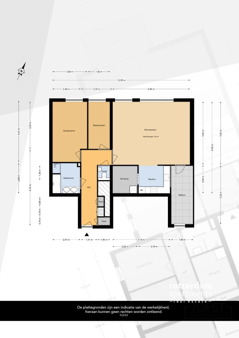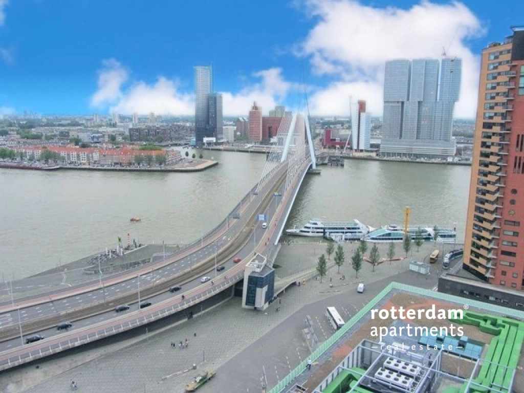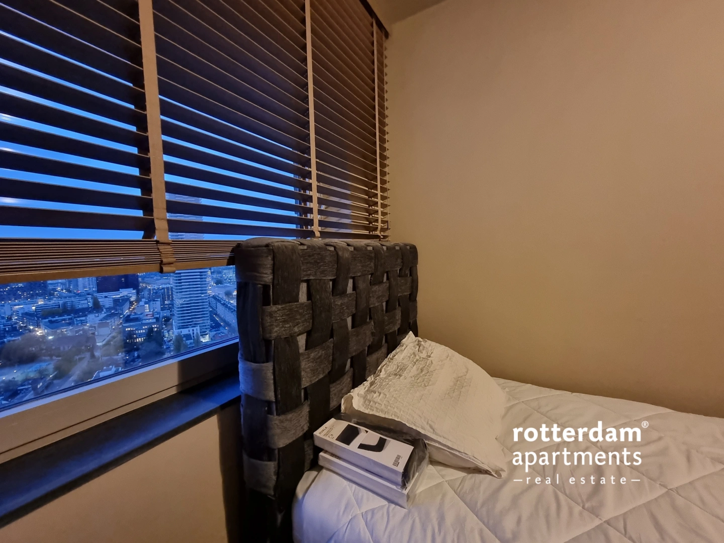 30th floor: Entrance to the apartment. Spacious hallway with access to all rooms, a separate toilet, meter cupboard, and ample storage space. The living room is located at the rear of the building and enjoys abundant natural light and beautiful city views thanks to the large windows. The balcony overlooking the Erasmus Bridge is accessible from the living room. The new, luxurious open-plan kitchen is equipped with high-quality built-in appliances, including an induction cooktop with a luxury extractor hood, a fridge-freezer, a dishwasher, and a combination microwave/oven. The apartment has two spacious and bright bedrooms. The fully tiled, luxurious bathroom features a walk-in shower, a bathtub with various functions, and a double sink with a mirror.