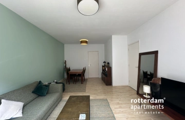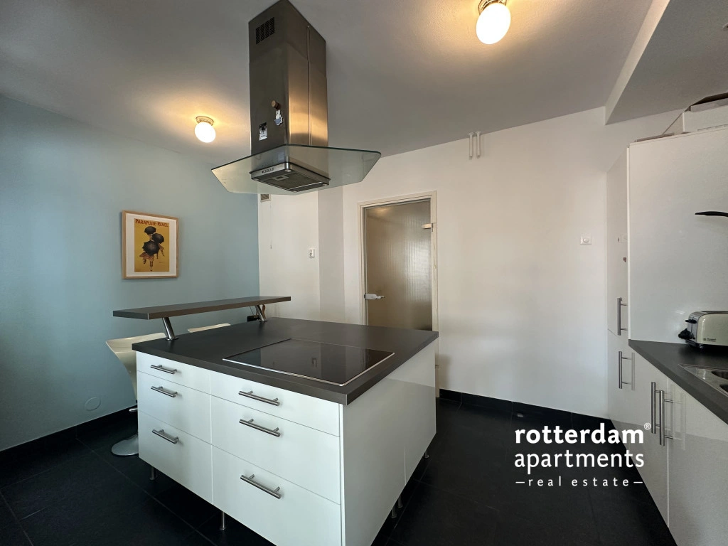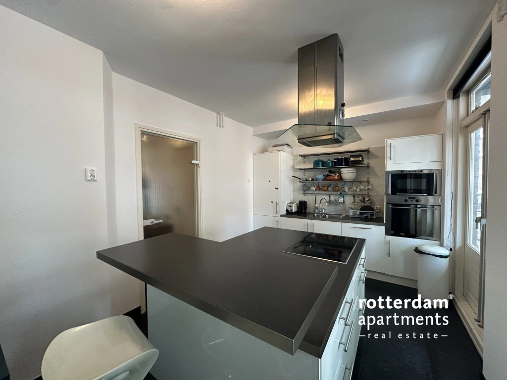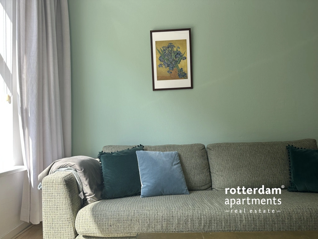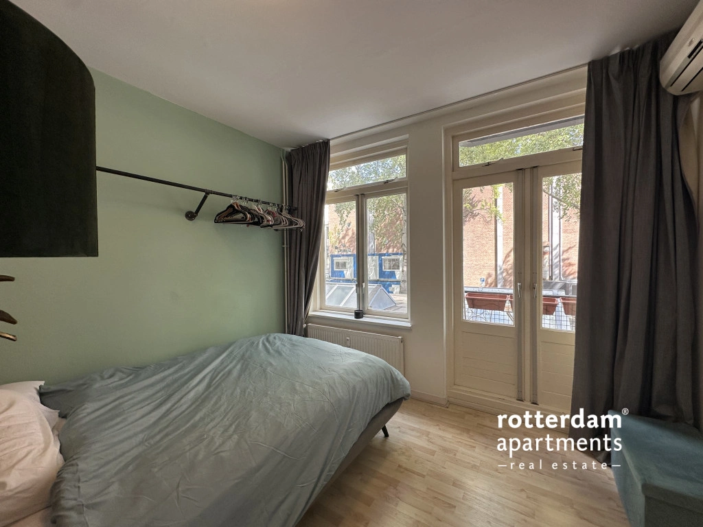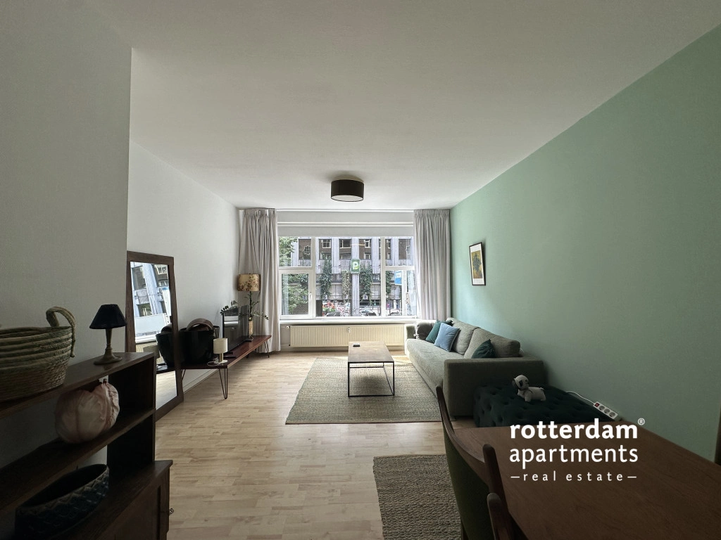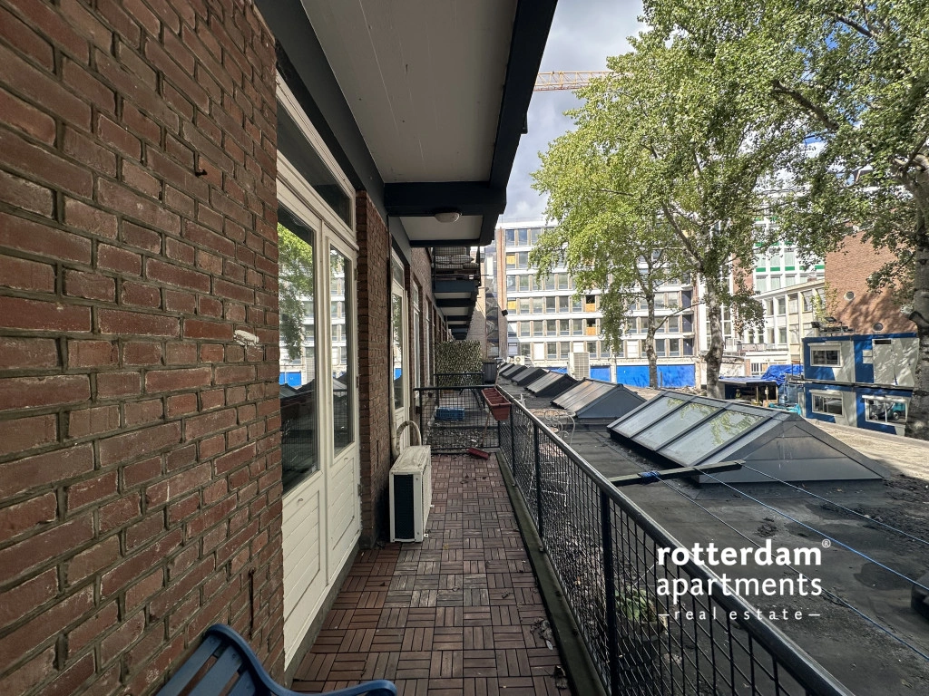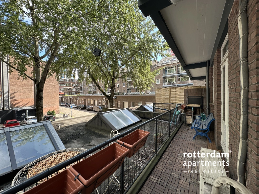 Furnished 3-room apartment on Hartmansstraat , in the heart of Rotterdam's vibrant city center. The apartment is located on the first floor and features a balcony spanning the entire width of the apartment at the rear.