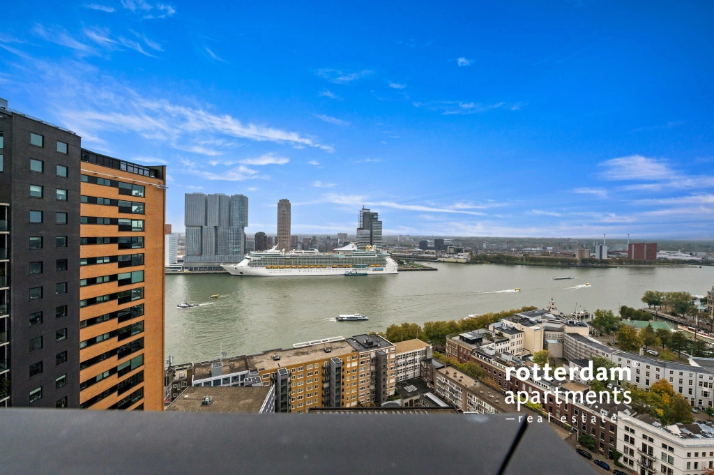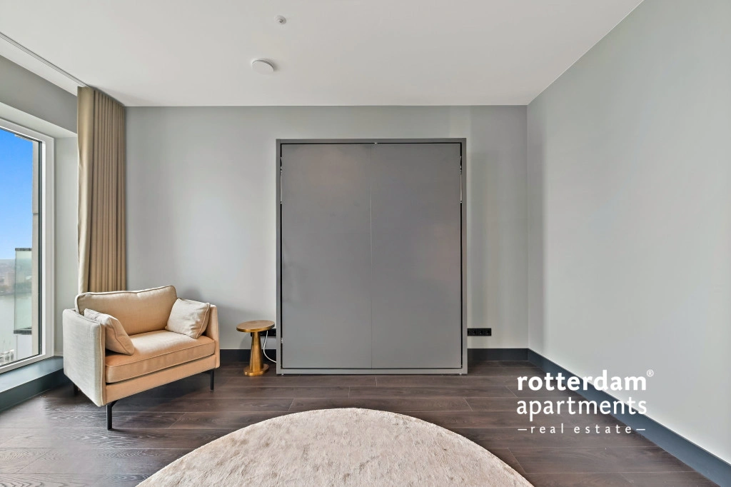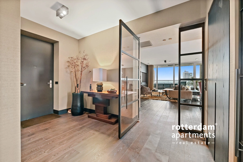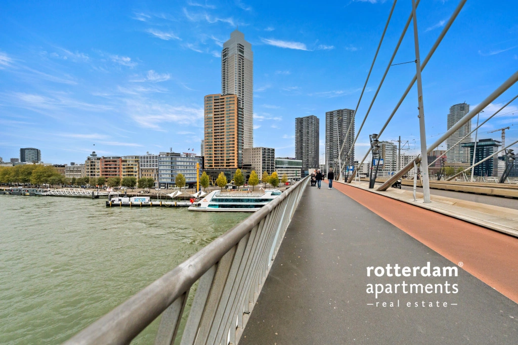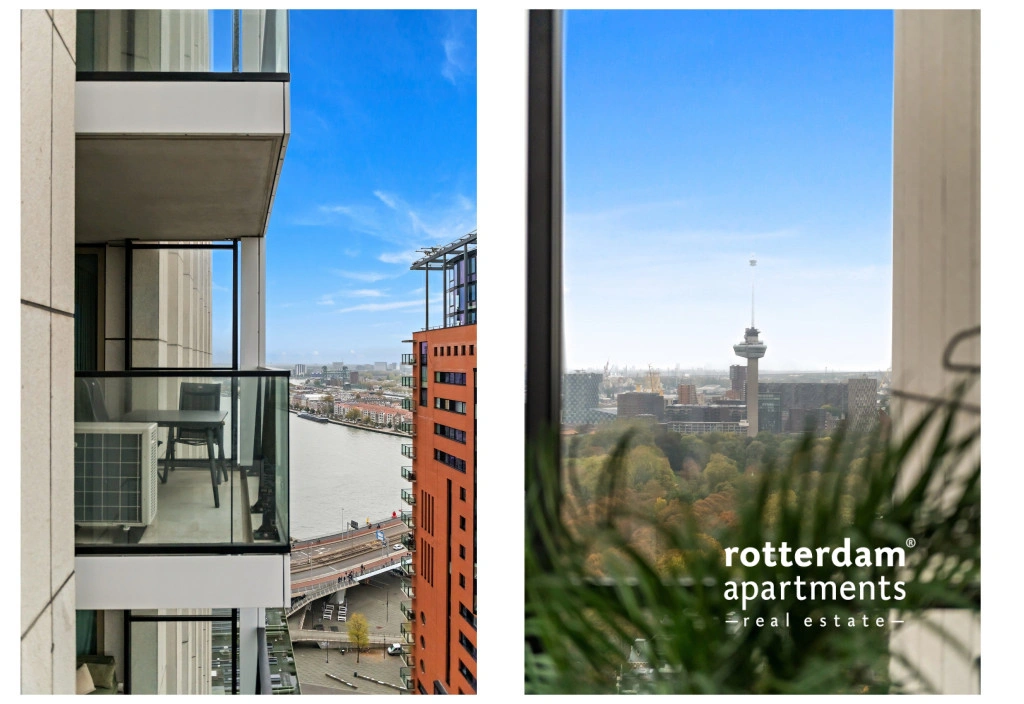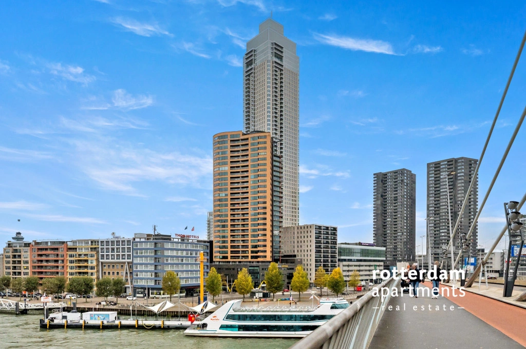 At the foot of the Maas River, in the iconic Zalmhaven Tower , lies this impressive apartment of approximately 192 m² on the 24th floor , with panoramic views of the Erasmus Bridge and the Kop van Zuid. The apartment features four bedrooms , two bathrooms , two balconies , three toilets , and two private garages . Thanks to its luxurious finishes, excellent natural light, and high-quality furnishings, this apartment offers top-notch living comfort.