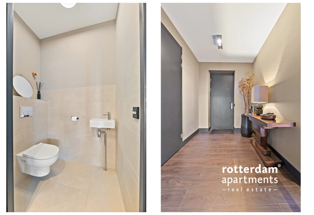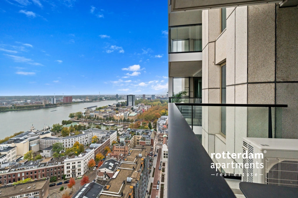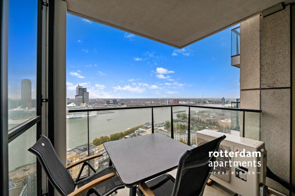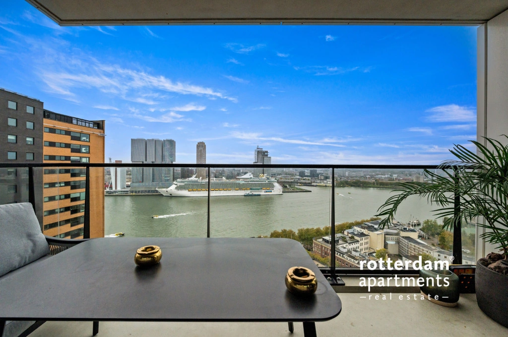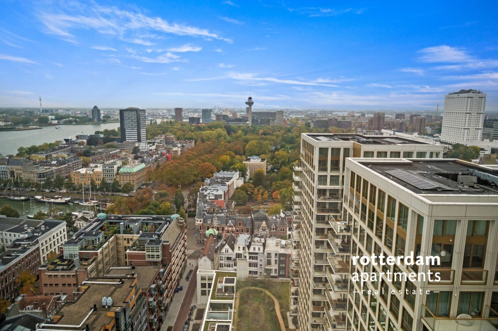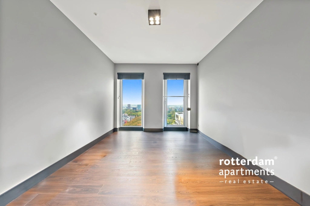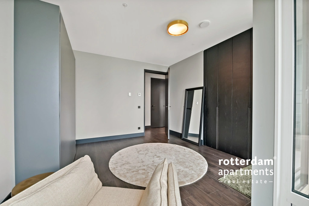 At the foot of the Maas River, in the iconic Zalmhaven Tower , lies this impressive apartment of approximately 192 m² on the 24th floor , with panoramic views of the Erasmus Bridge and the Kop van Zuid. The apartment features four bedrooms , two bathrooms , two balconies , three toilets , and two private garages . Thanks to its luxurious finishes, excellent natural light, and high-quality furnishings, this apartment offers top-notch living comfort.