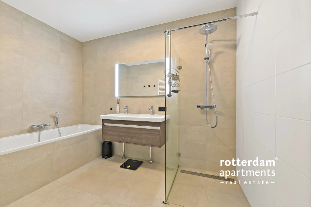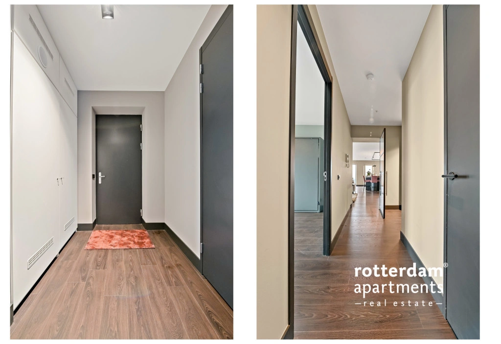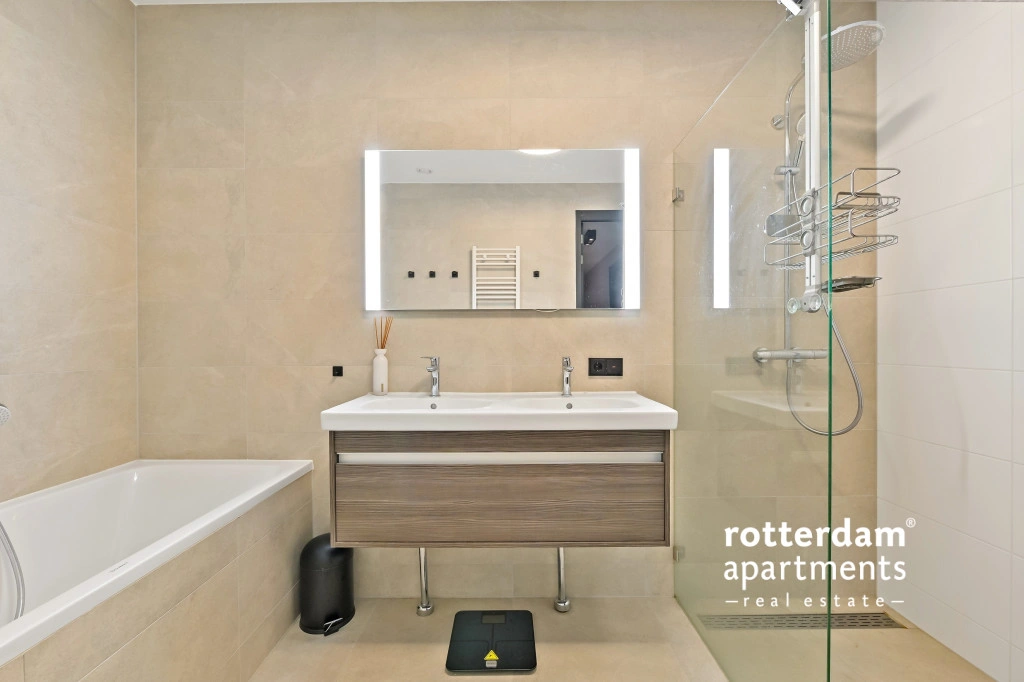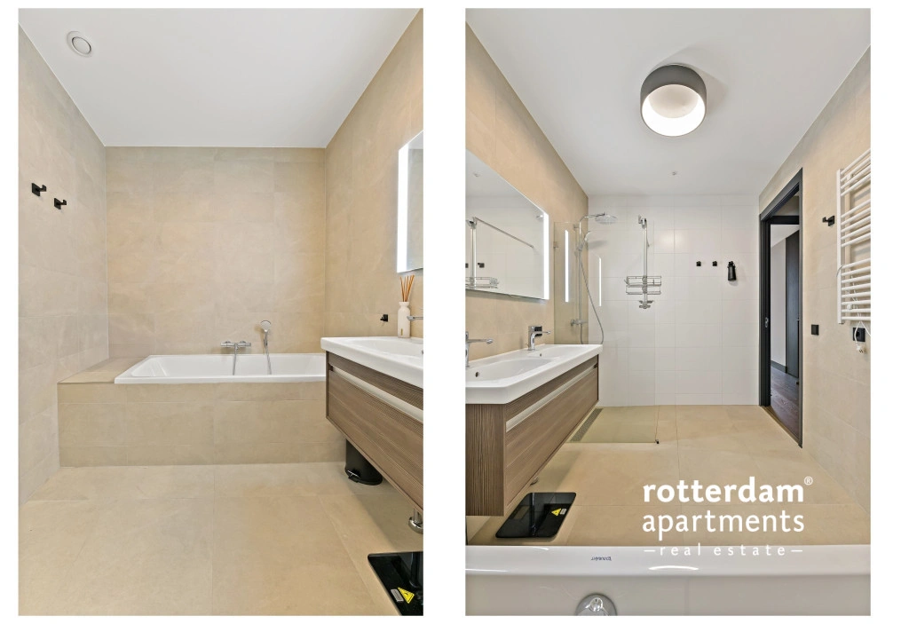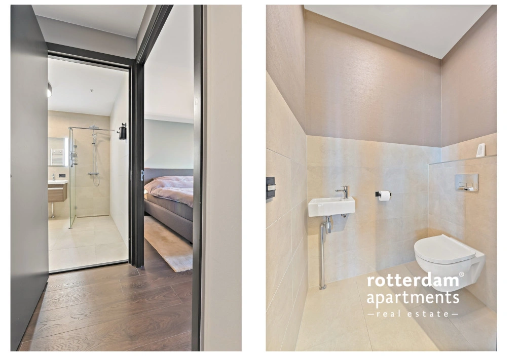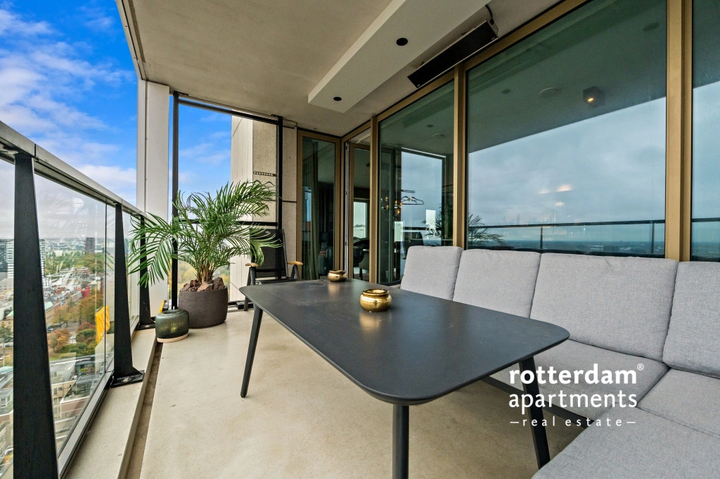 At the foot of the Maas River, in the iconic Zalmhaven Tower , lies this impressive apartment of approximately 192 m² on the 24th floor , with panoramic views of the Erasmus Bridge and the Kop van Zuid. The apartment features four bedrooms , two bathrooms , two balconies , three toilets , and two private garages . Thanks to its luxurious finishes, excellent natural light, and high-quality furnishings, this apartment offers top-notch living comfort.