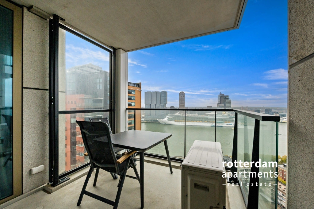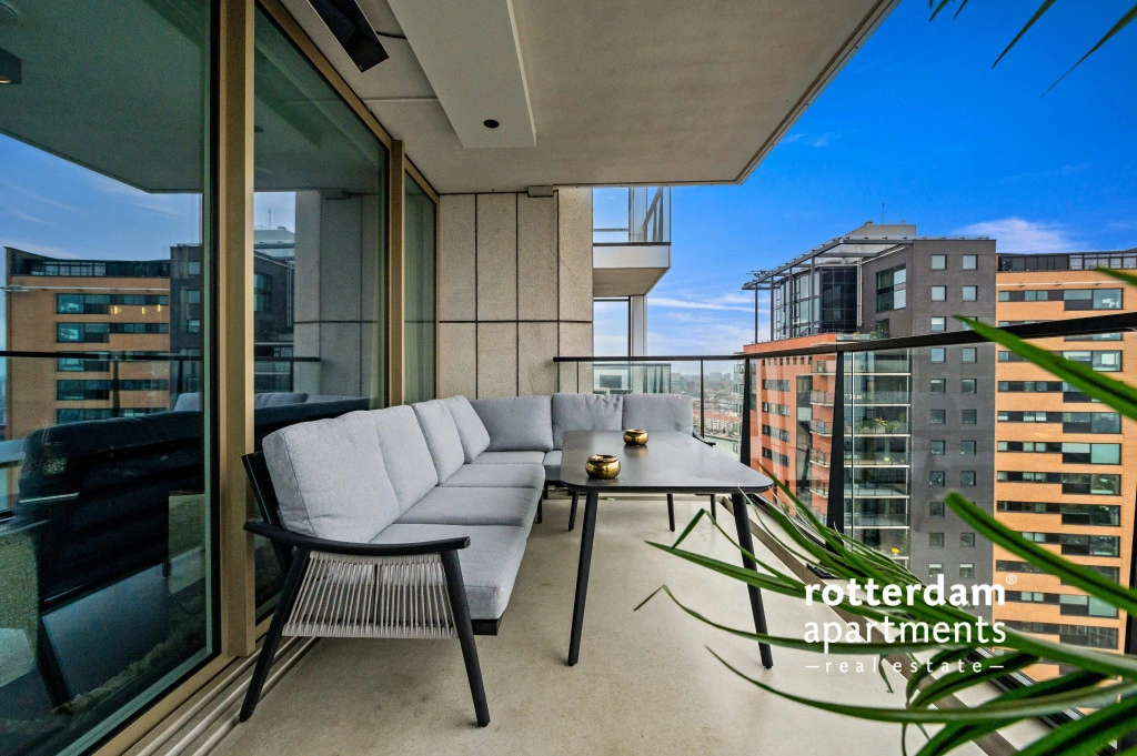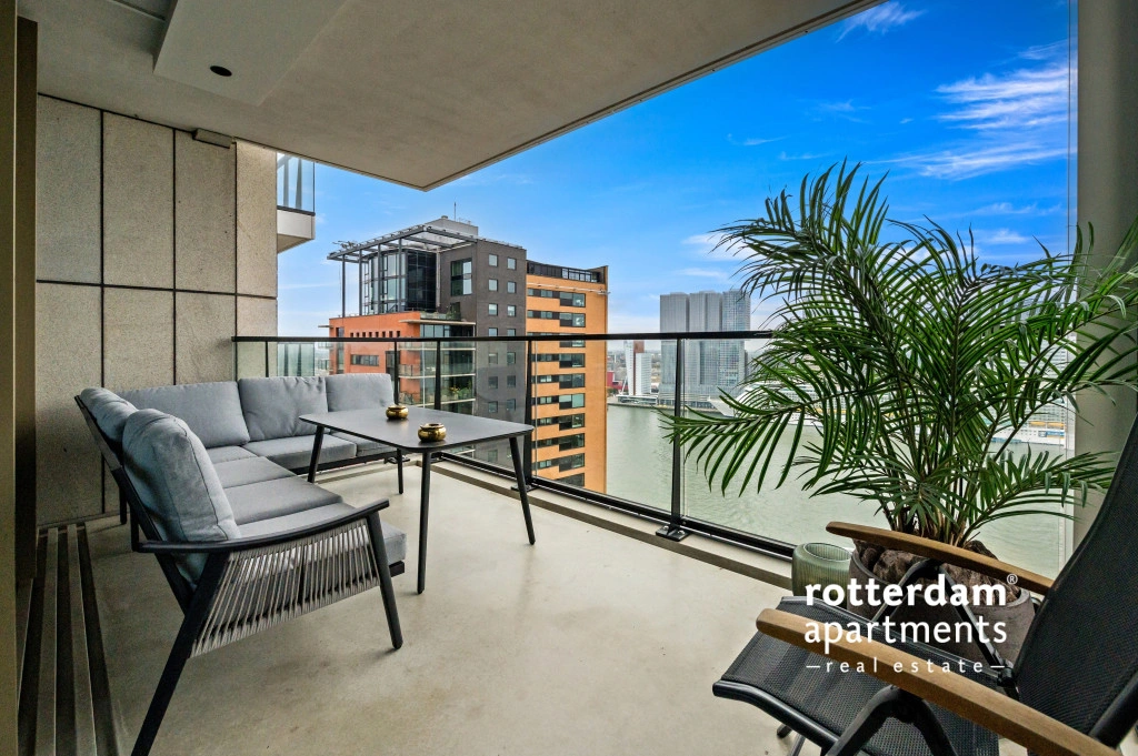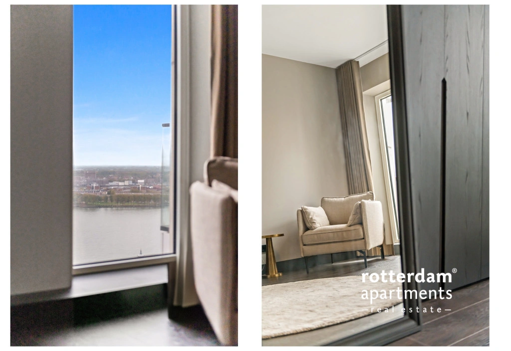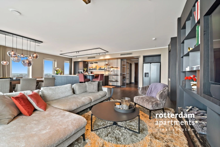 The spacious living room with open-plan kitchen offers panoramic views through large windows and is furnished with a comfortable corner sofa, a coffee table, an armchair, atmospheric lighting, and a modern wall unit. The living room opens onto the first balcony , with panoramic views of the Maas River and the Erasmus Bridge—a perfect spot to relax or dine with a city view.