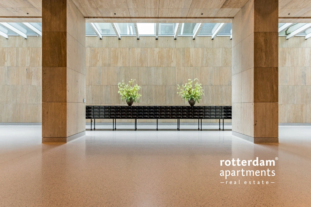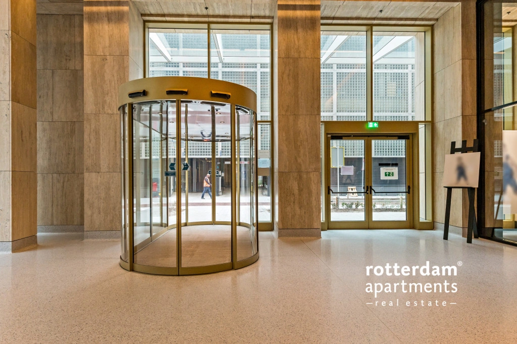 Entrance into the main hall of the Gedampte Zalmhaven tower, equipped with mailboxes, a doorbell panel, and a concierge.