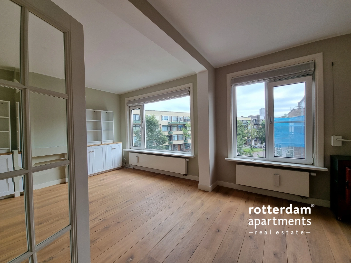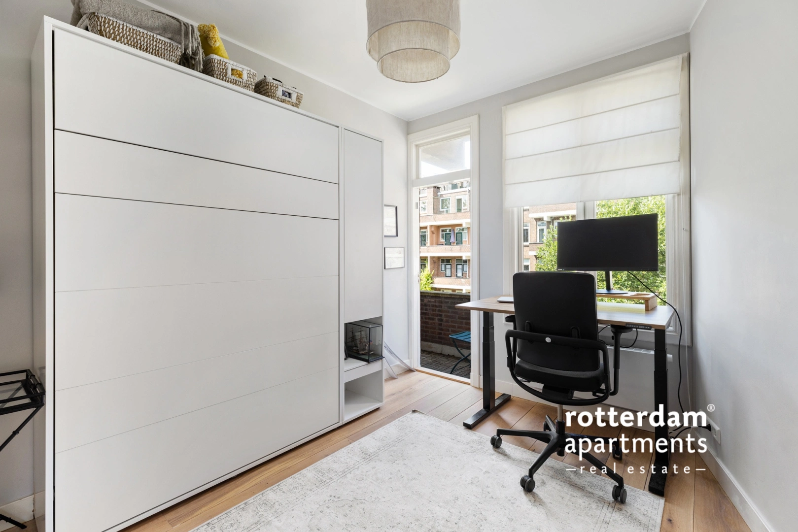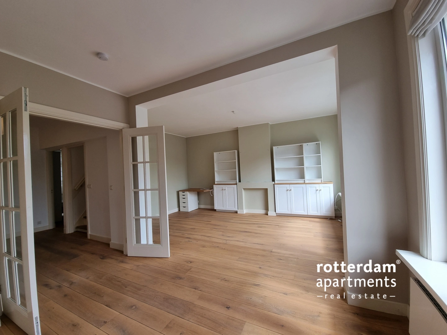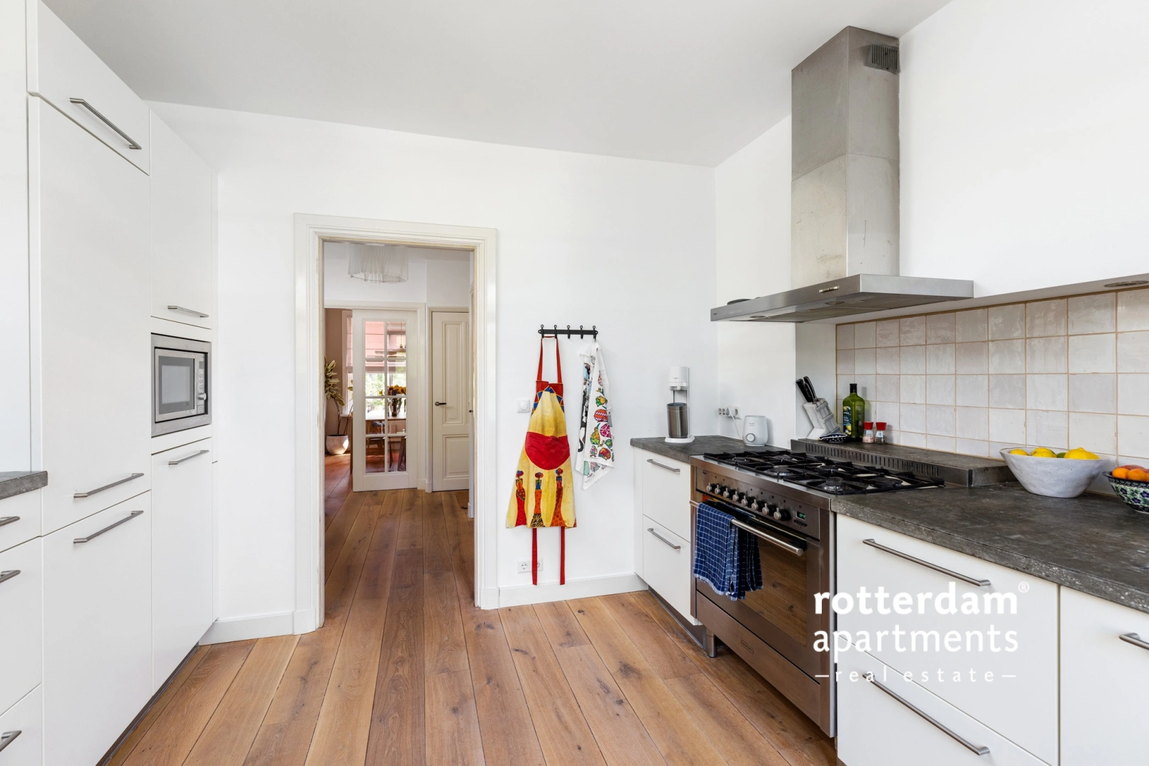 Entrance apartment; hall with access to all rooms, the stairs to the third floor, storage space, meter cupboard and toilet. The bright living room is divided into a dining and sitting area and is located at the front of the apartment. The spacious kitchen is equipped with various high end built-in appliances including a 6-burner gas hob with extractor, oven, refrigerator and dishwasher. The balcony is also accessible at the rear, suitable for a small table; Ideal for a cup of coffee or a snack on the balcony. Bedroom I has a built-in bed (140 x 200), so that the room can function as both a double bedroom and an office.
