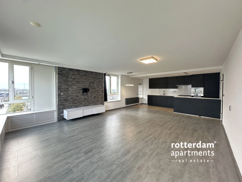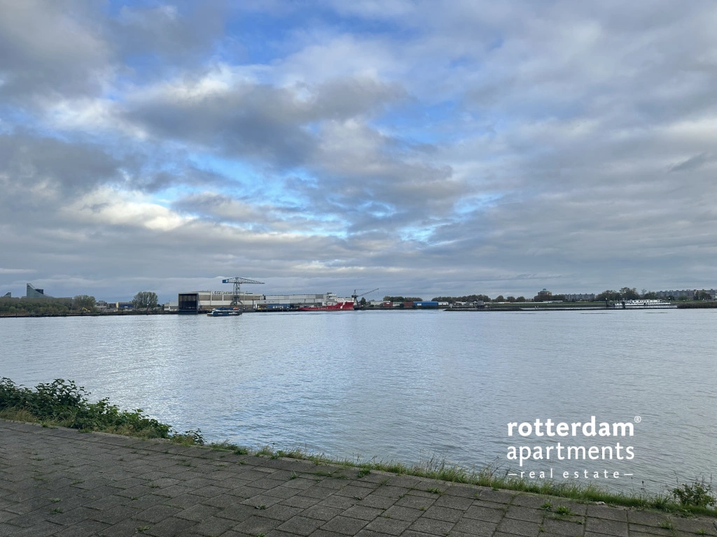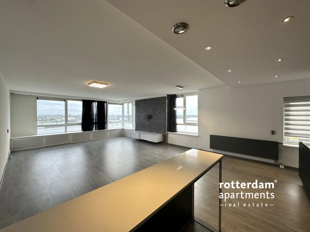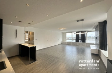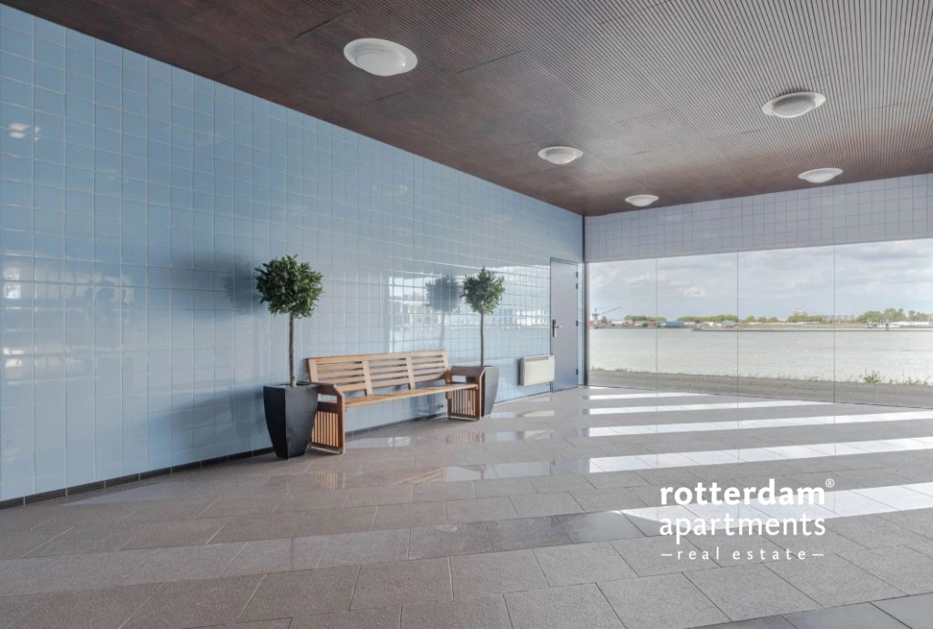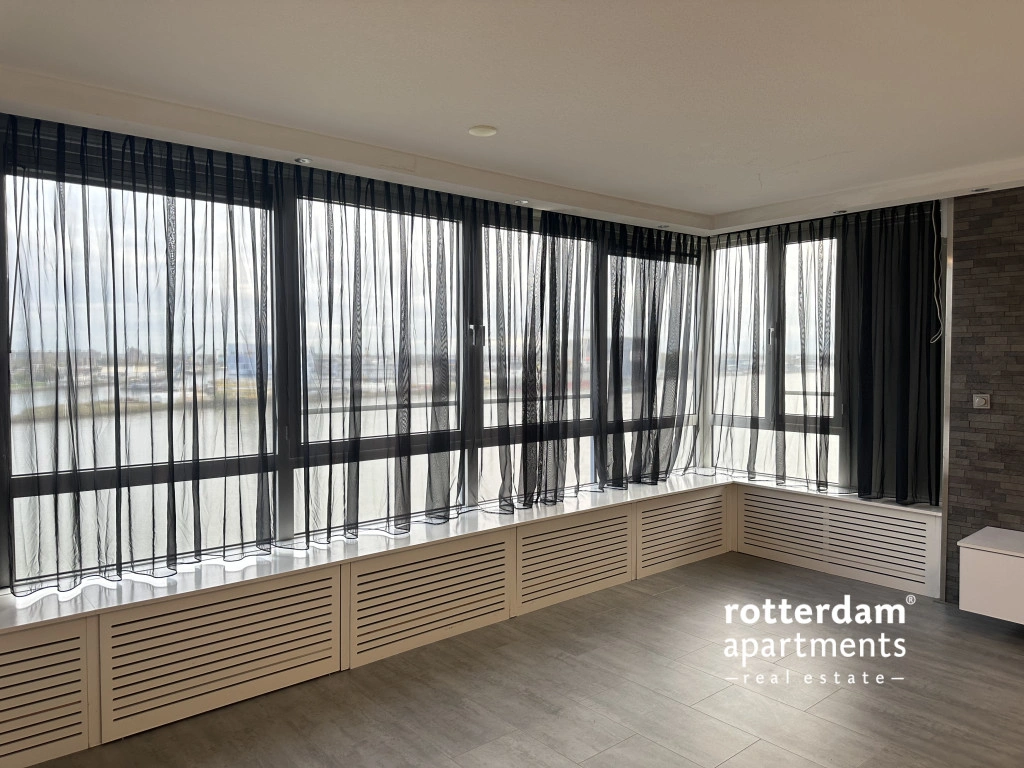 The living room is remarkably bright thanks to the large windows that provide ample natural light and a stunning view of the Maas River and the Rotterdam skyline . The space is sleekly finished, features a modern TV stand, and offers plenty of room for personalization.