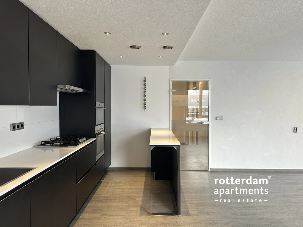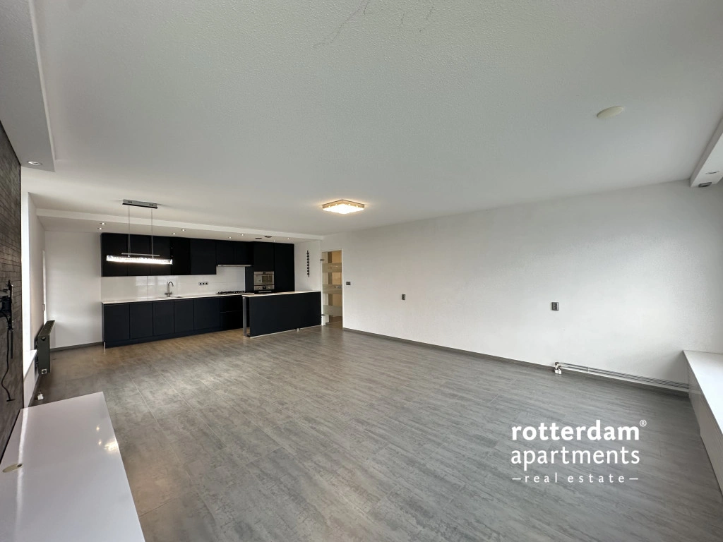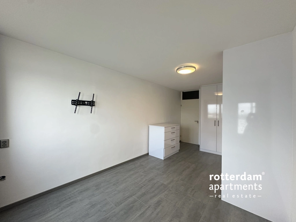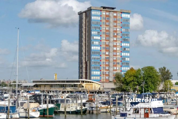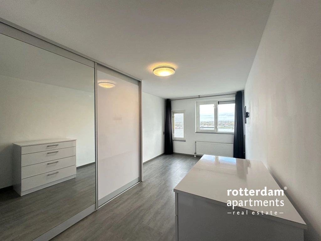 The living room is remarkably bright thanks to the large windows that provide ample natural light and a stunning view of the Maas River and the Rotterdam skyline . The space is sleekly finished, features a modern TV stand, and offers plenty of room for personalization.