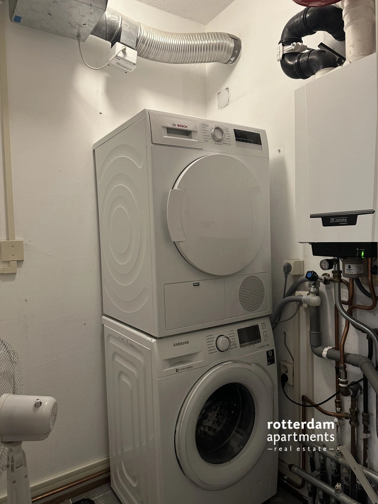 The property is easily accessible with many amenities nearby. It's within cycling distance of Rotterdam city center, a supermarket, and a train station. Furthermore, the nearest major highway is just a two-minute drive away.