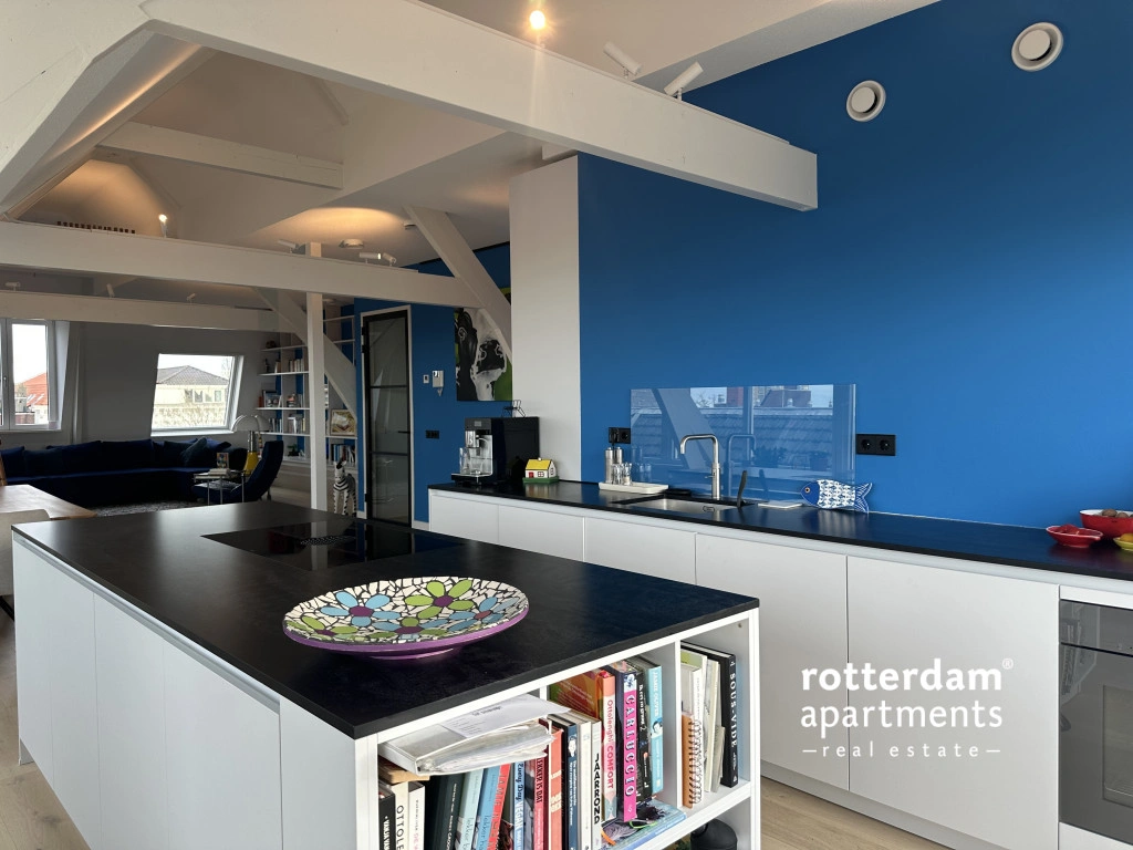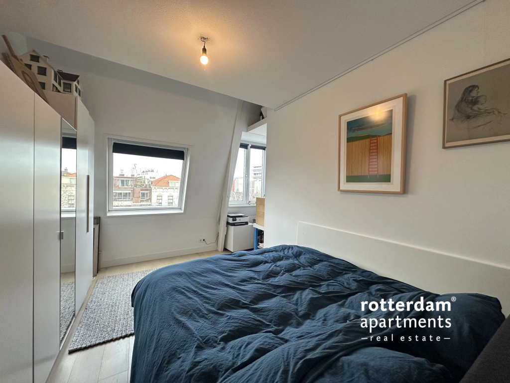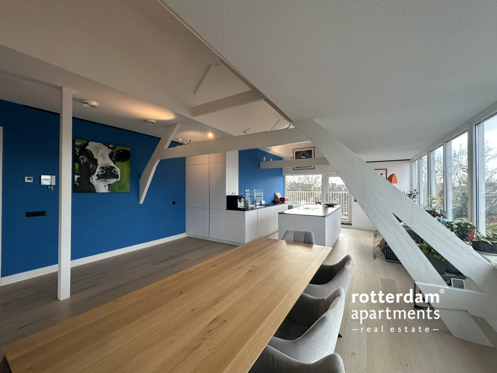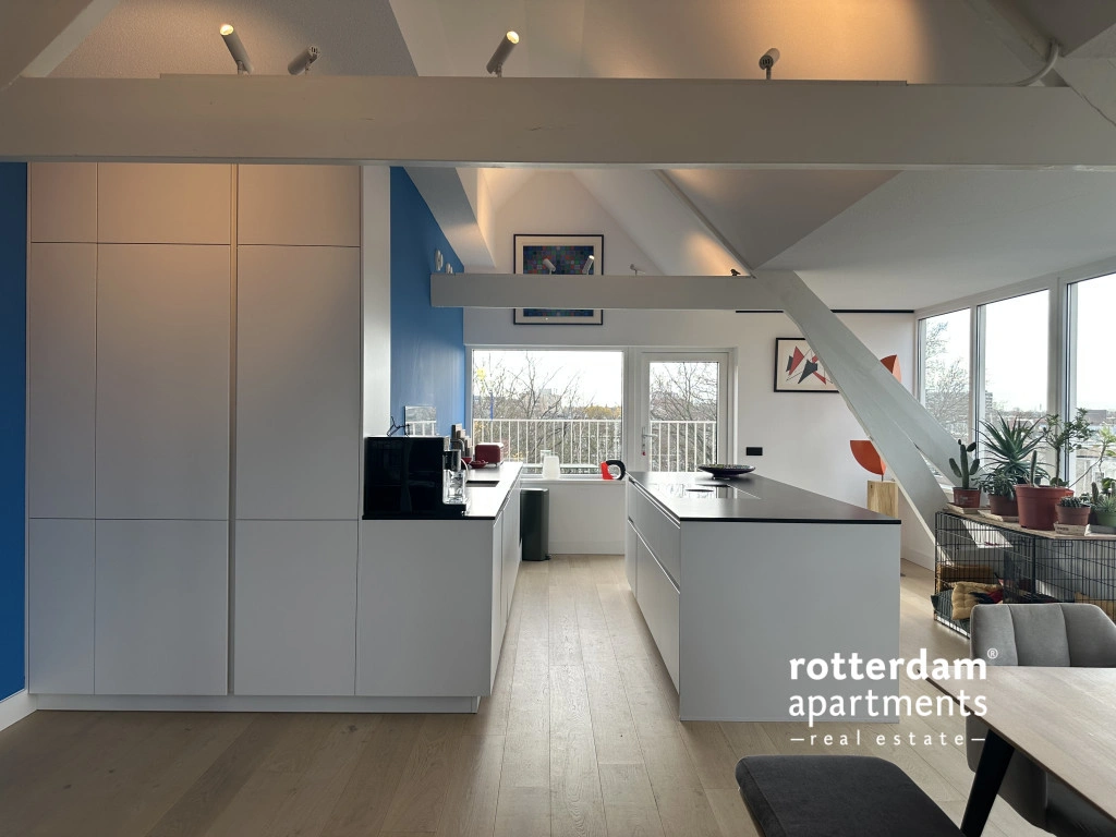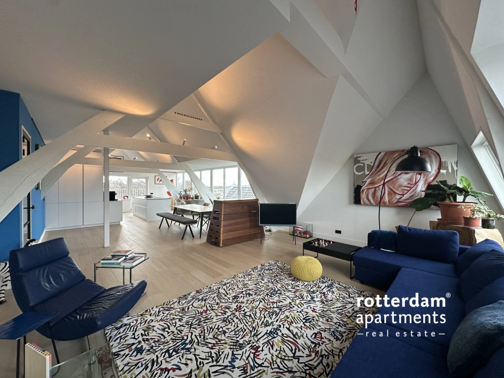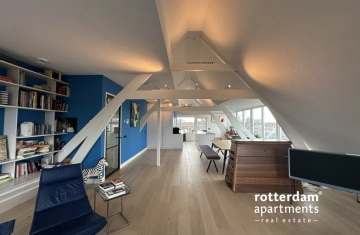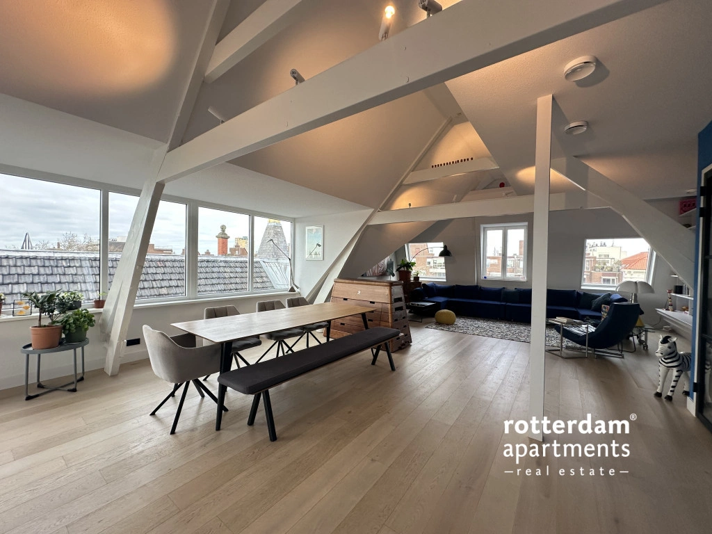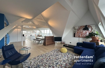 Characteristic short-stay apartment on the 4th floor of Schiekade, Rotterdam. The living area extends openly beneath the impressive beamed ceiling, with large windows allowing ample natural light to flood in. The apartment is fully furnished and has 1 bedroom.