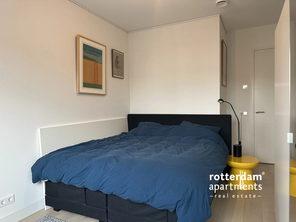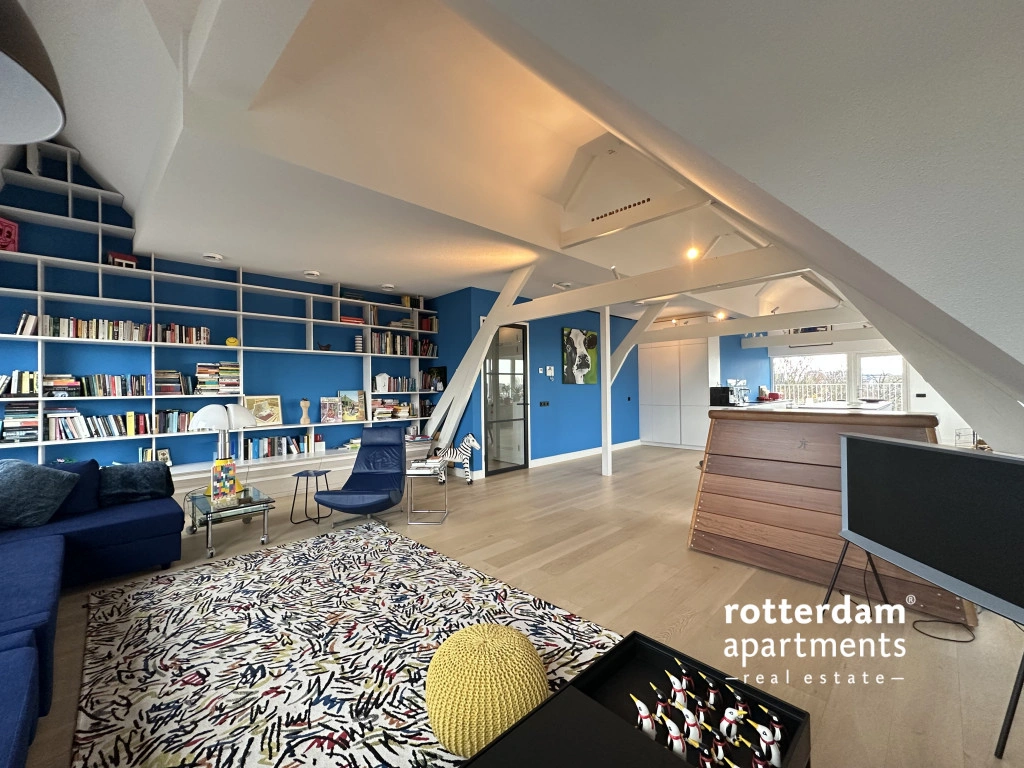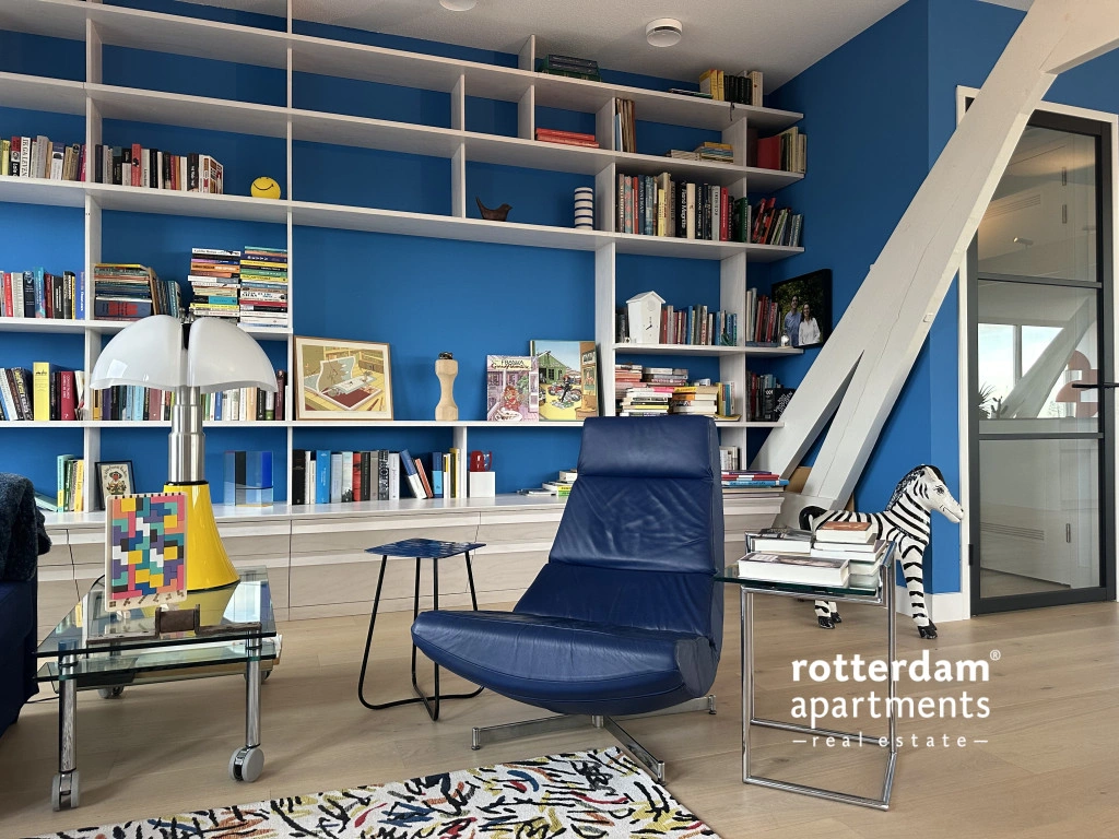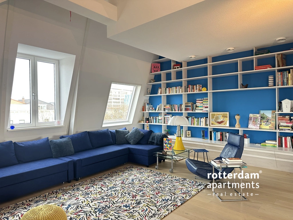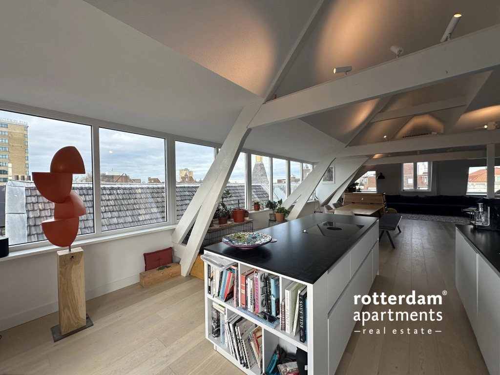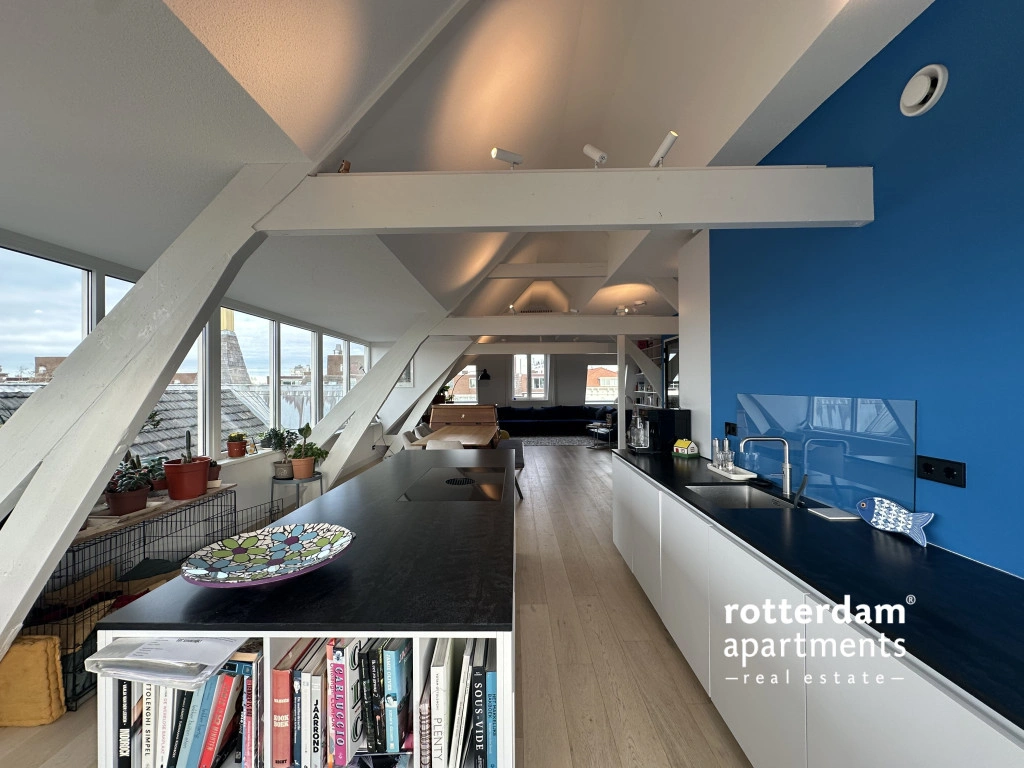 Characteristic short-stay apartment on the 4th floor of Schiekade, Rotterdam. The living area extends openly beneath the impressive beamed ceiling, with large windows allowing ample natural light to flood in. The apartment is fully furnished and has 1 bedroom.