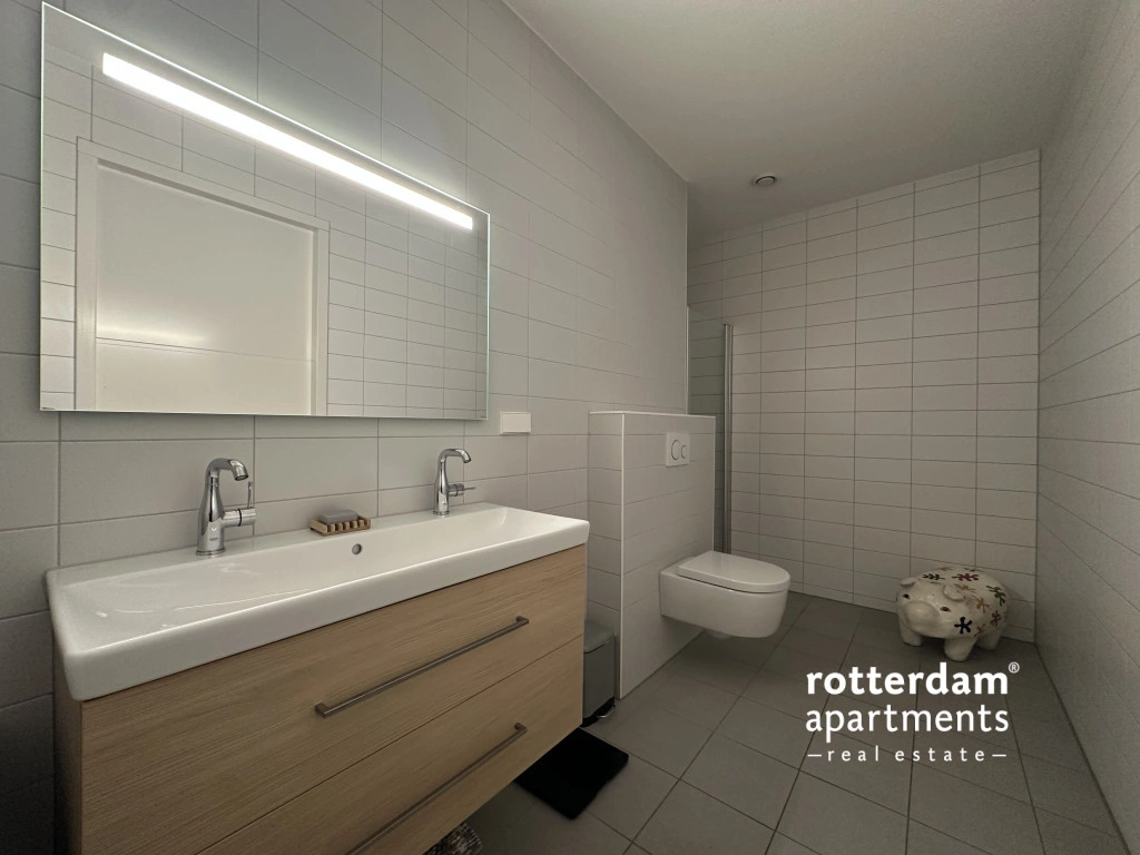 The modern bathroom features a double sink, a large, illuminated mirror, a spacious shower, and a toilet. There's also a separate toilet accessible from the hallway.