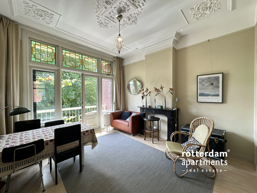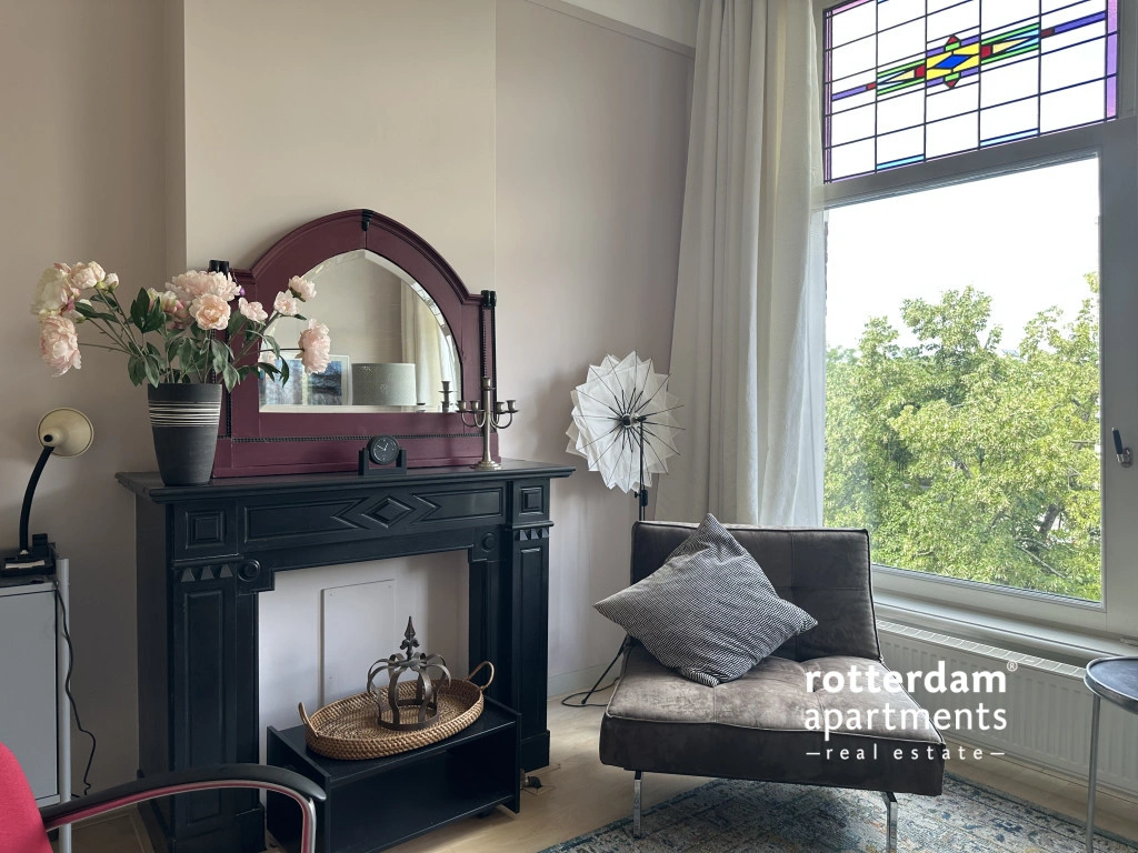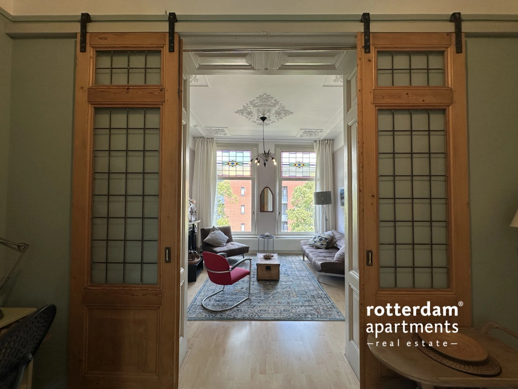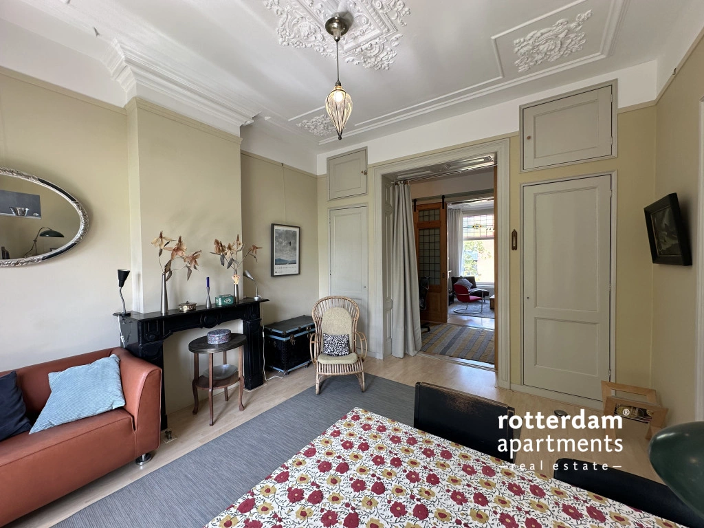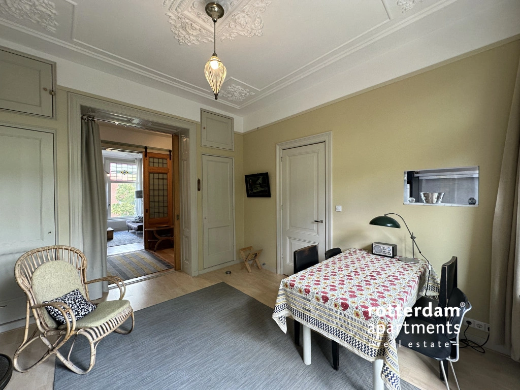 Located in the popular Middelland neighborhood, within walking distance of Heemraadspark and various cafes, shops, and public transport, this charming and characteristic apartment sits on the second floor of an atmospheric townhouse. The home is rich in original features such as stained-glass windows, sliding doors, moldings, built-in wardrobes, and fireplaces, combined with modern amenities.