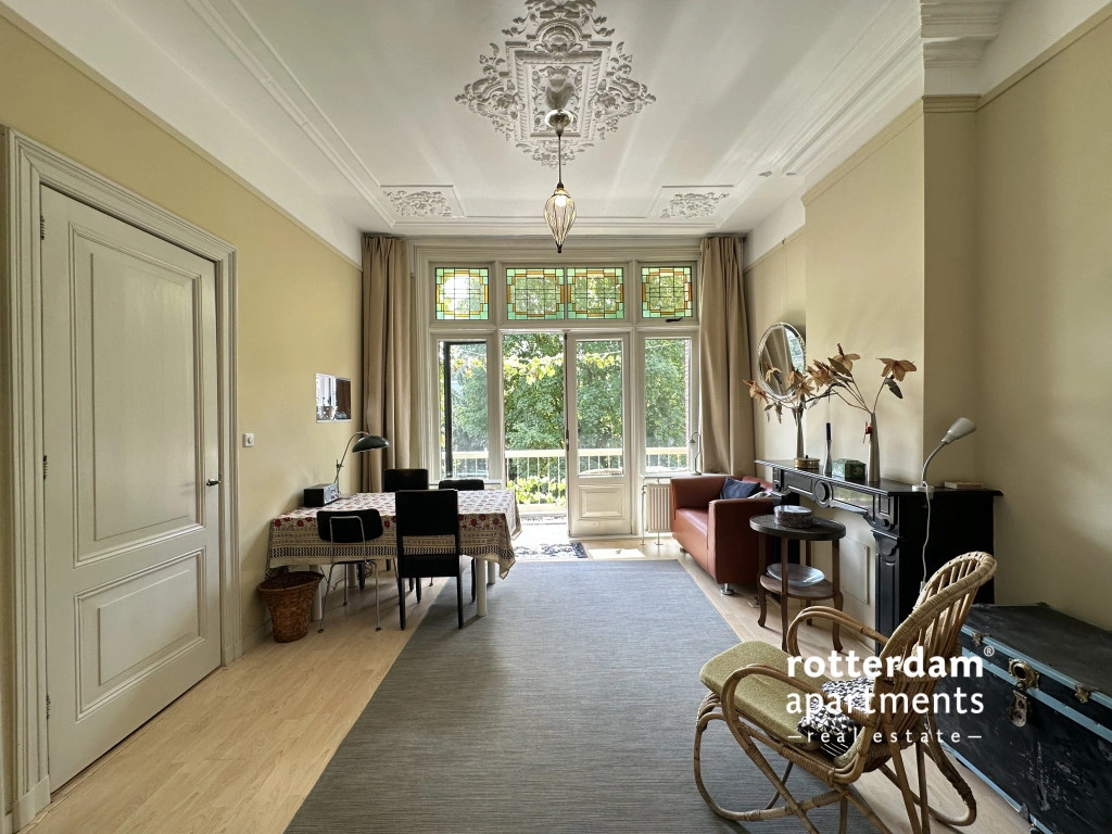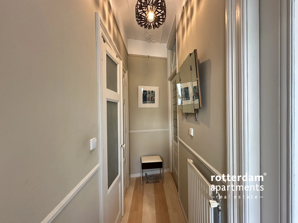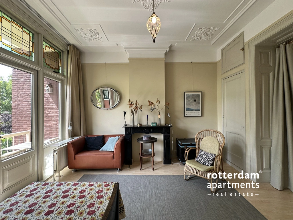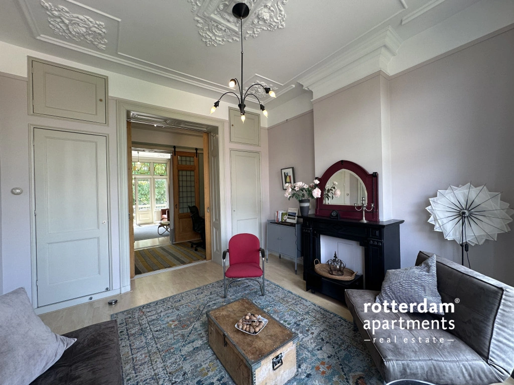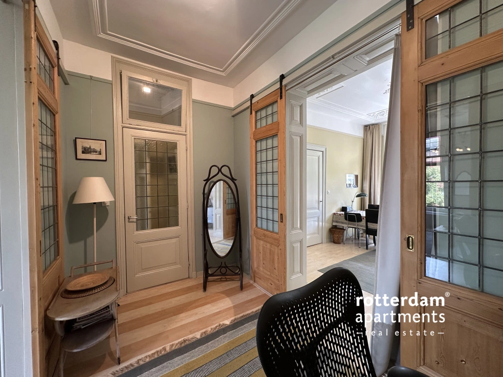 Located in the popular Middelland neighborhood, within walking distance of Heemraadspark and various cafes, shops, and public transport, this charming and characteristic apartment sits on the second floor of an atmospheric townhouse. The home is rich in original features such as stained-glass windows, sliding doors, moldings, built-in wardrobes, and fireplaces, combined with modern amenities.
