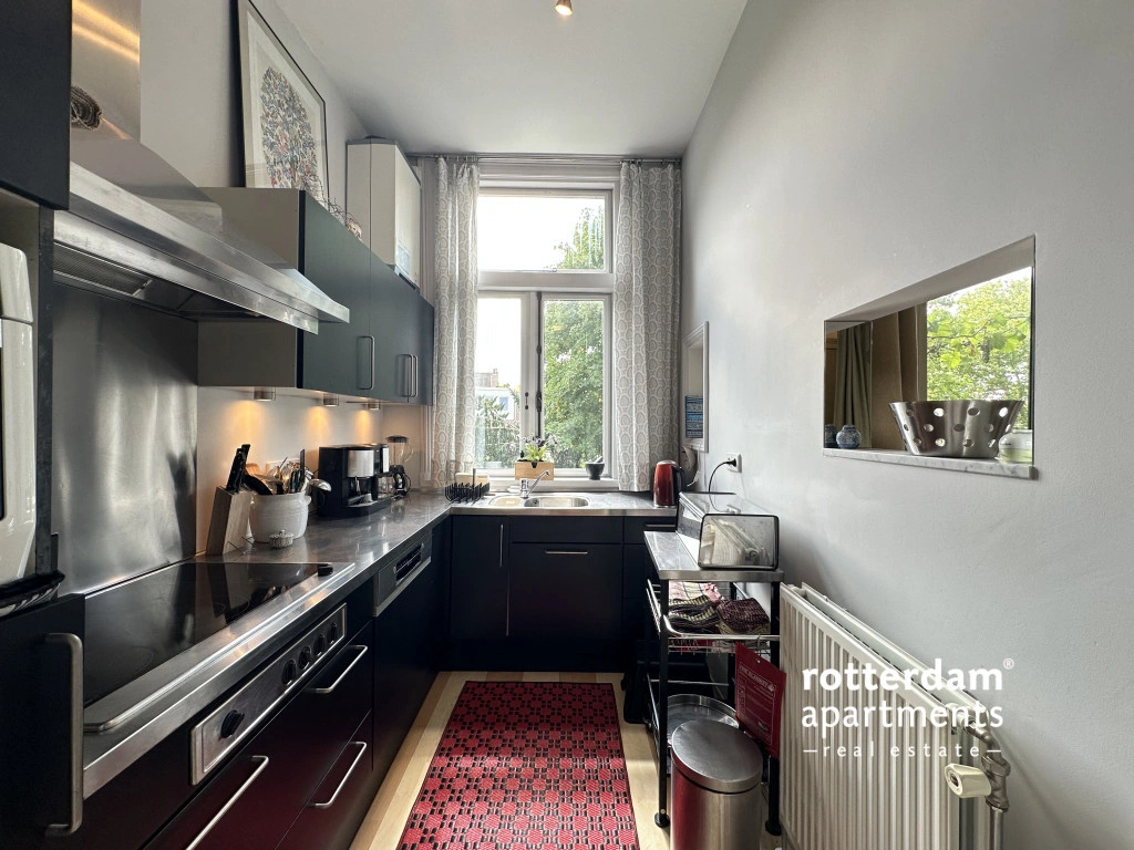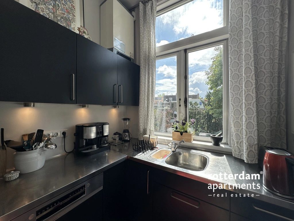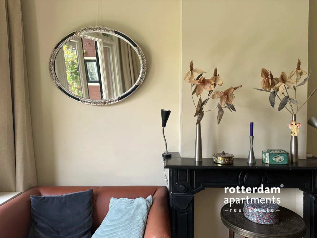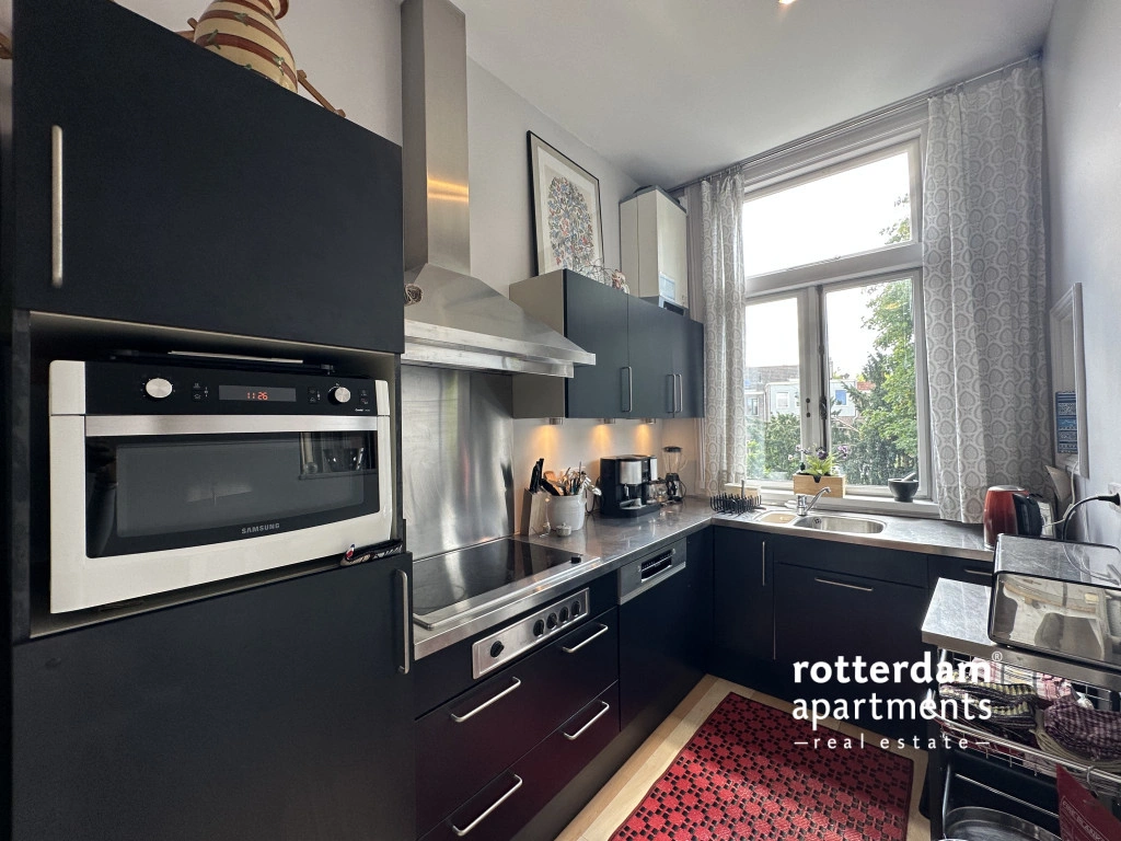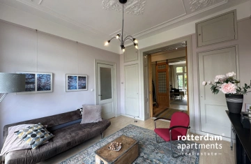 The apartment is situated opposite a small green park on a quiet lane with ample parking. Additionally, it is within walking distance of the Erasmus MC, various museums, cinemas, and other cultural amenities.