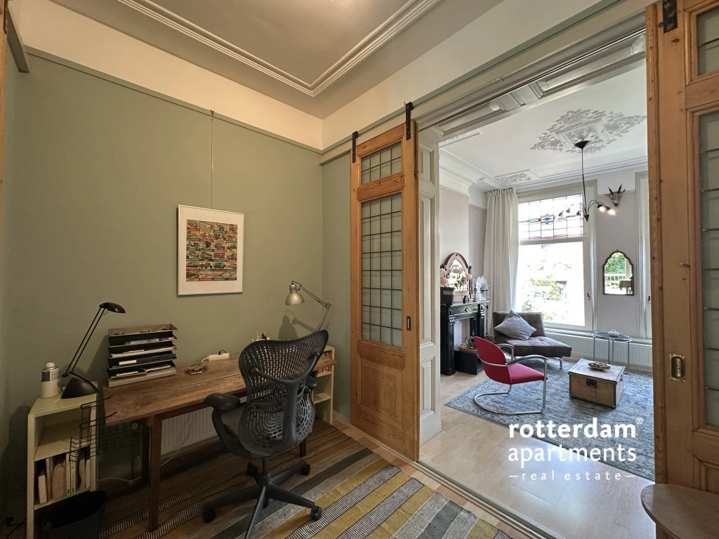 Sliding doors with stained glass lead to the central room, currently used as a workspace with a desk. This space connects the dining room to the front room, which serves as the living room. Here too, you'll find a fireplace, beautiful ceiling ornaments, large windows, and stained glass skylights, providing ample natural light and character.