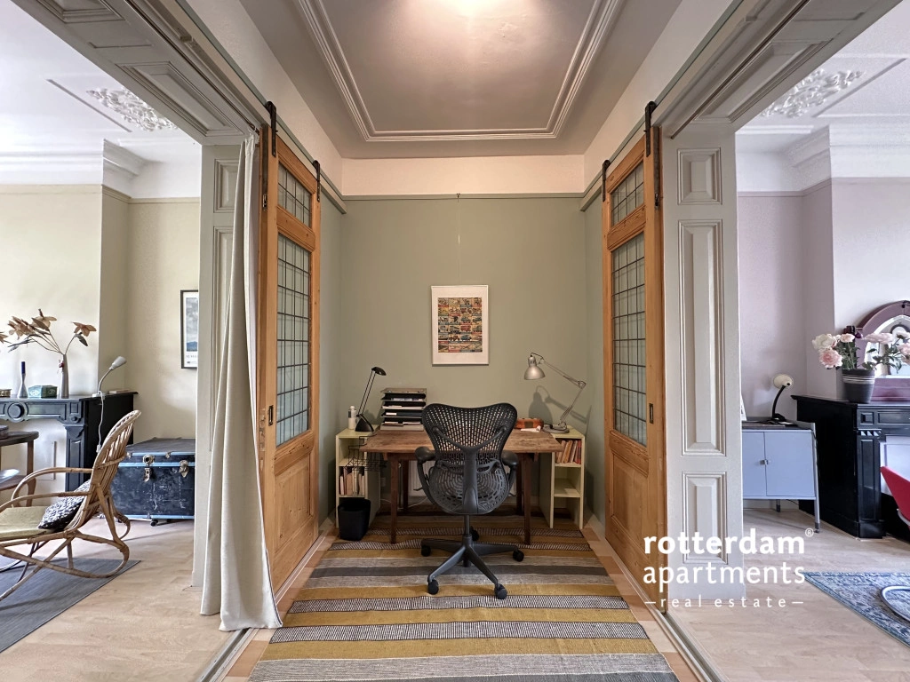 Sliding doors with stained glass lead to the central room, currently furnished as a workspace with a desk. This space connects the dining room to the front room, which serves as the living room. Here, too, one finds a fireplace, beautiful ceiling ornaments, large windows, and stained-glass transom windows, ensuring plenty of natural light and character.