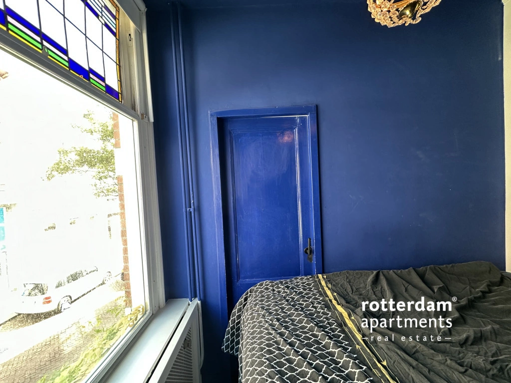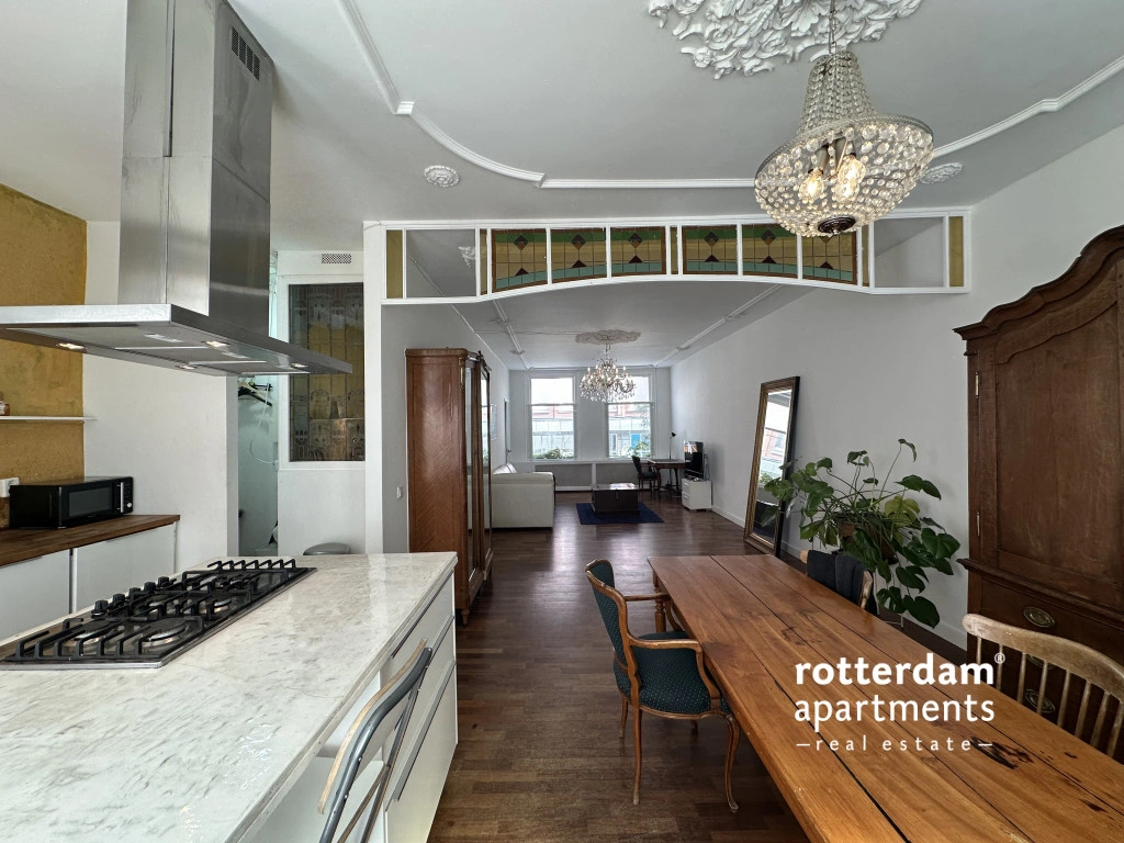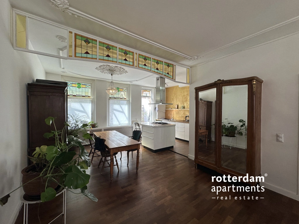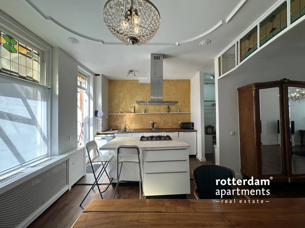 This elegant 1-bedroom apartment is located on the Schietbaanstraat in Rotterdam Centrum, and offers a charming blend of character and comfort. With beautiful stained glass windows, two chandeliers, high ceilings and wooden floors throughout, the apartment has a warm and classical atmosphere. The living room is spacious and bright, and flows into a dining area with access to a modern open kitchen, equipped with a cooking island, gas stove, and built-in storage.