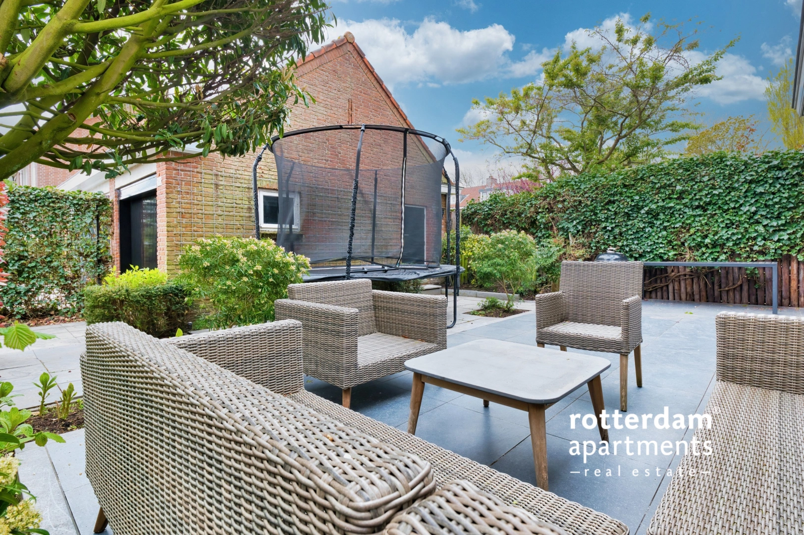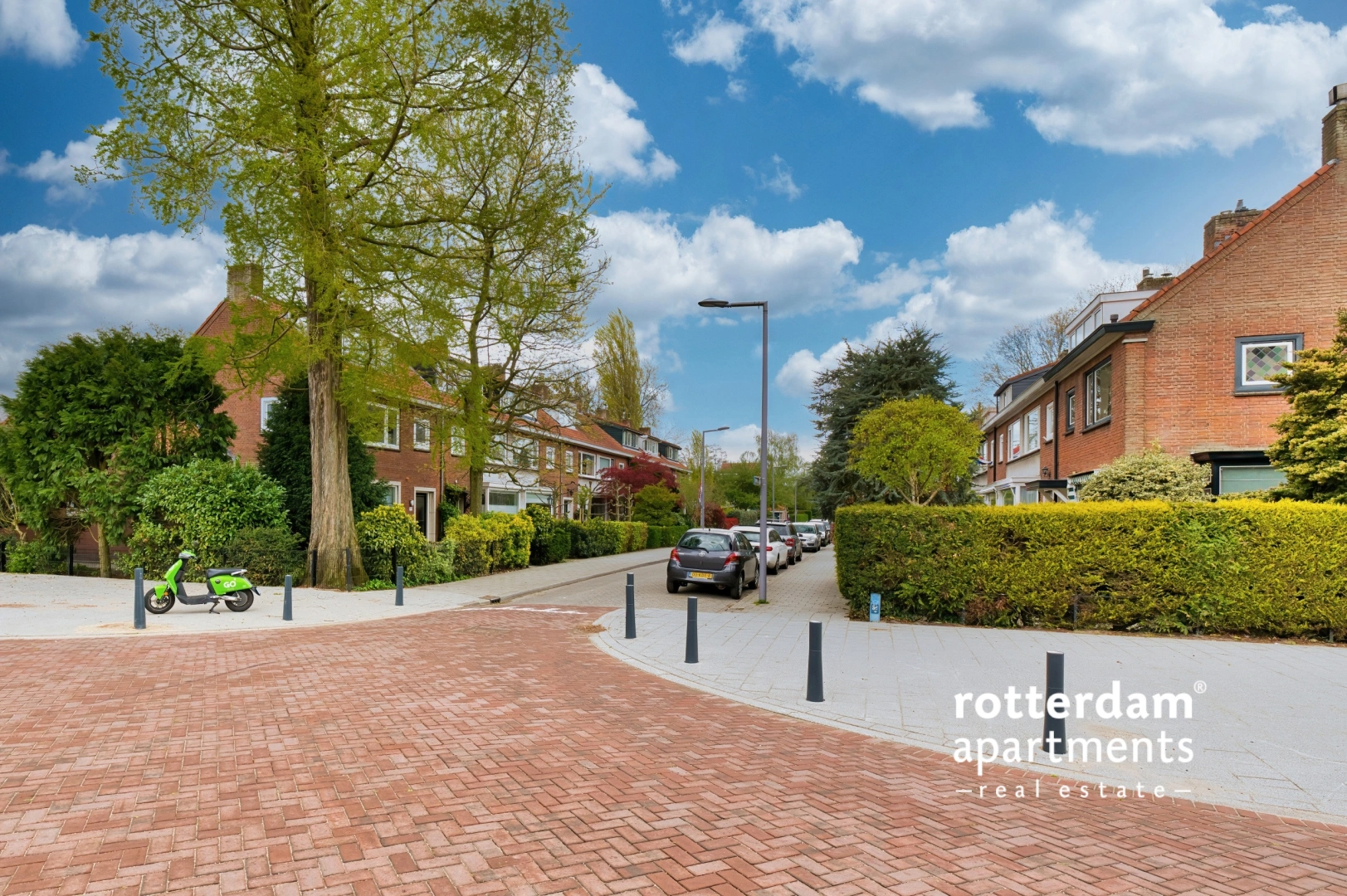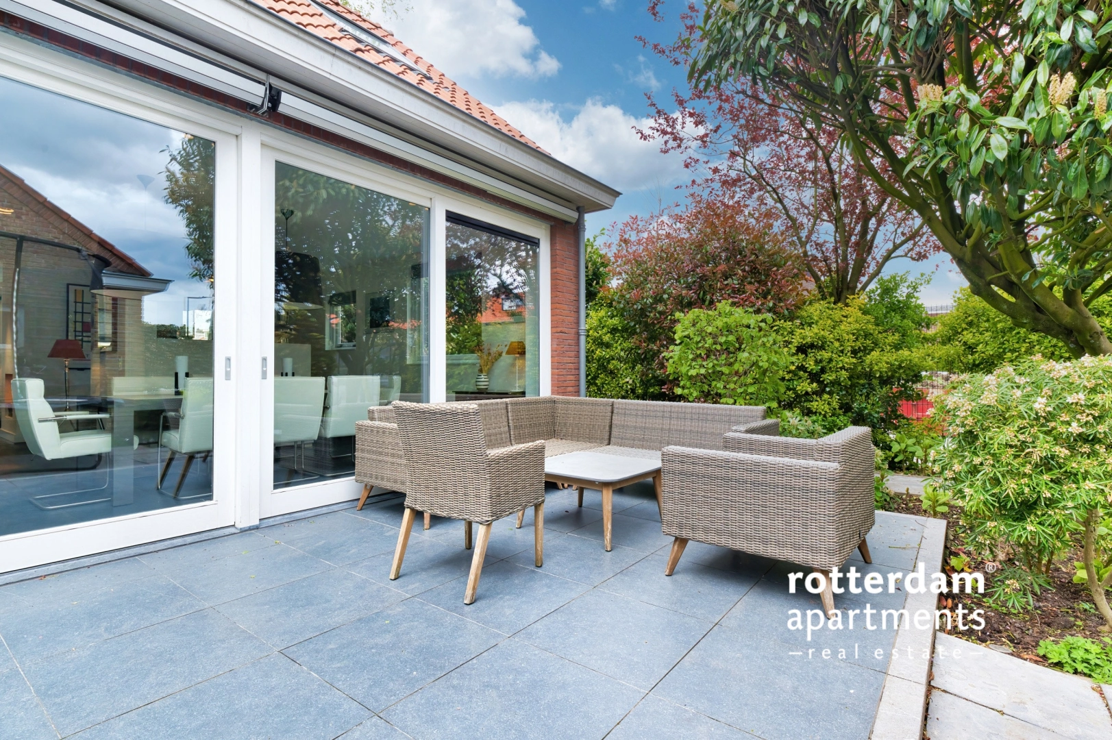Furnished CORNER house (5/6 rooms) with driveway and separate garage. The backyard is located on the South East with an exit on the Burgemeester le Fevre de Montignylaan and located in the district called "Hillegersberg". Very conveniently located in relation to shops on Bergse Dorpsstraat and shops on Van Beethovenlaan and various supermarkets. Both Bergsche Plassen, Het Bergse Bos and the Rotte are also within walking distance. The center of Rotterdam is easily accessible by bicycle and public transport such as tram line 4 and bus lines 35 and 36 are nearby. Also well located in relation to international schools/primary and secondary schools.
