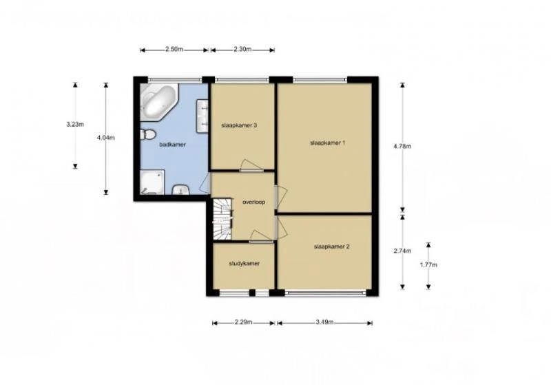 On the first floor, you'll find three bedrooms and a study. All bedrooms are furnished with a bed, wardrobe, and neutral walls.