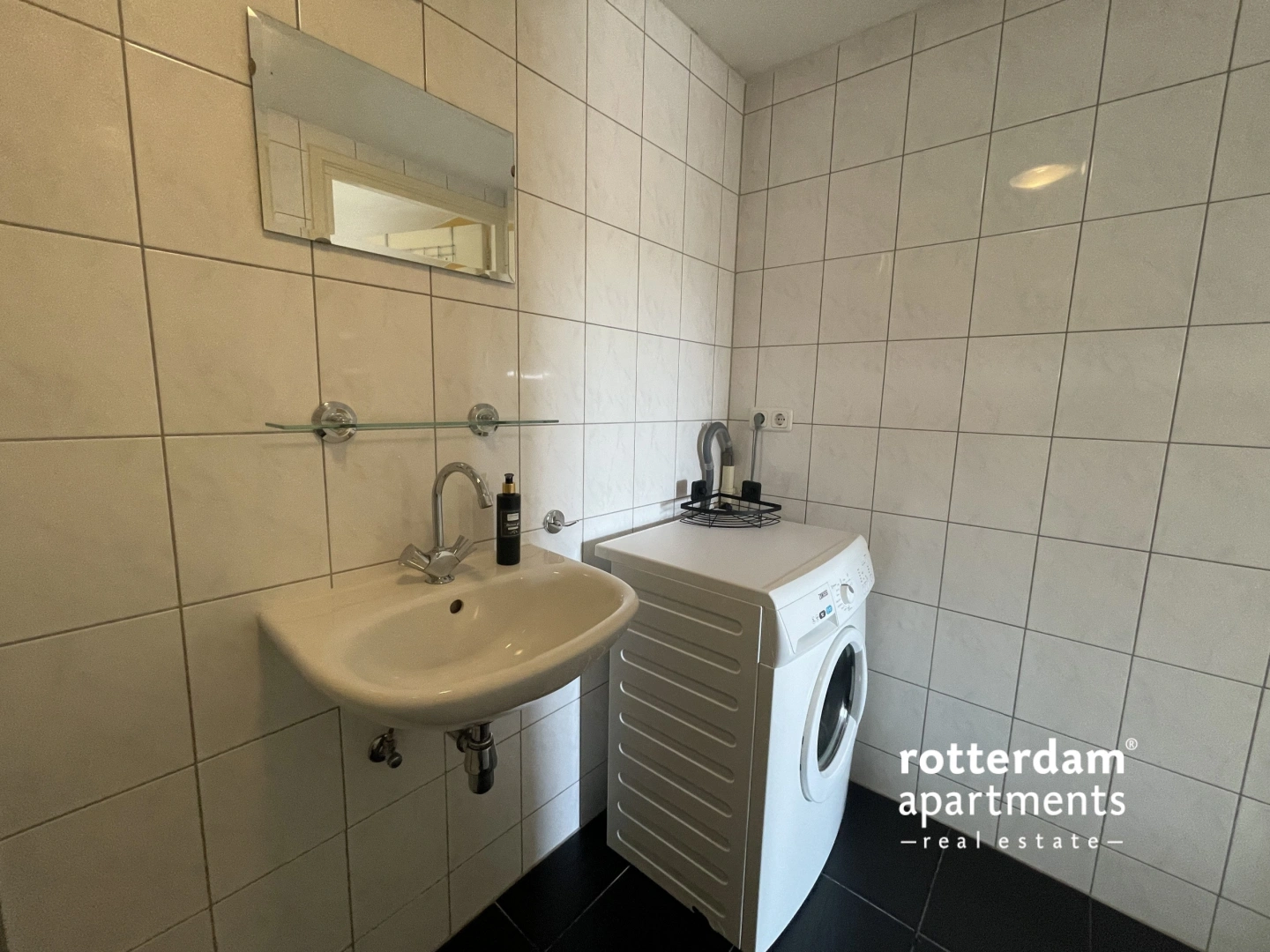 The studio's bathroom features a spacious shower, a sink with mirror and even a washing machine for the tenant's convenience. In addition, the toilet is located on the landing.