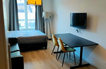 Shared entrance with mailboxes, doorbells, elevator and access to the shared garden. The studio is equipped with hip furniture, including. a double bed, wardrobe, table, chairs, TV. The open kitchen is equipped with a stove, extractor hood, refrigerator and microwave. The fully tiled bathroom has a shower and sink with mirror.