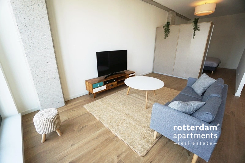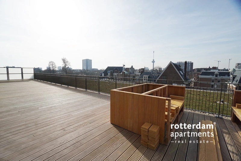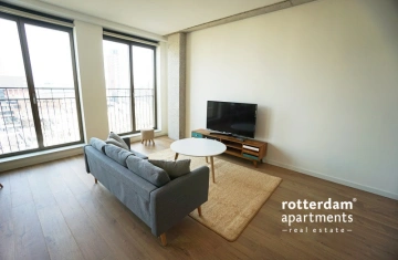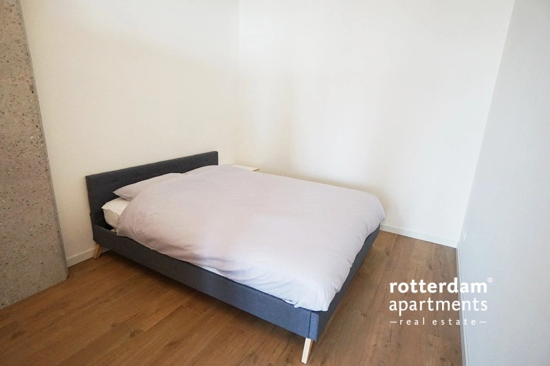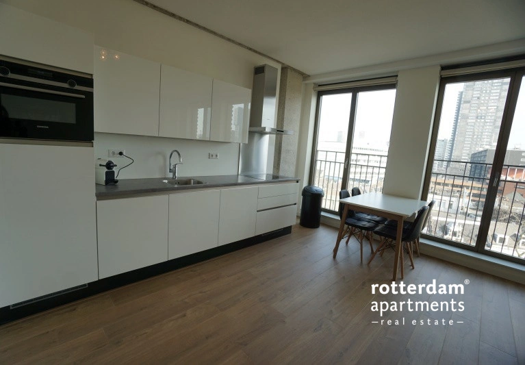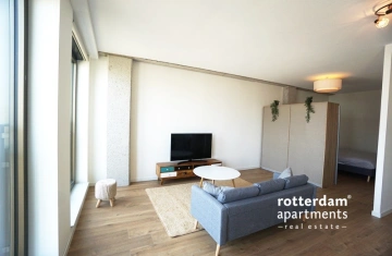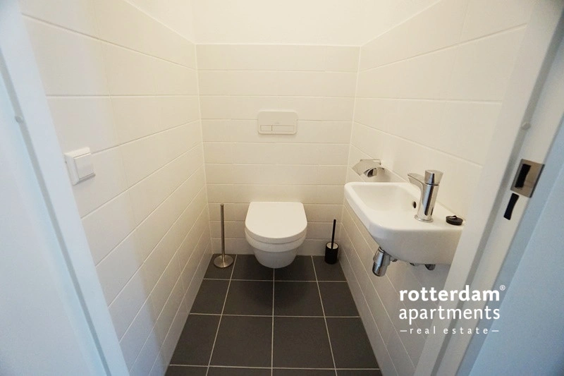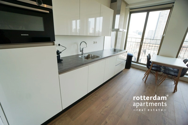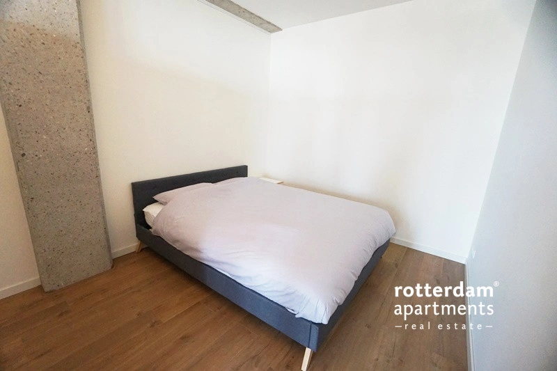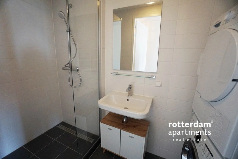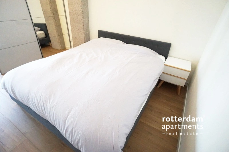 Stylish communal entrance. The house is fully equipped, modernly furnished and sleekly finished. There is a lot of light through the large floor-to-ceiling windows, the loft has a modern light quick step laminate. The modern kitchen is equipped with a dishwasher, combi oven, gas hob and extractor hood and a refrigerator. The beautifully finished bathroom has a walk-in shower, washbasin and mirror. The loft has a French balcony with a view of the Erasmus Bridge and the historic Scheepvaartkwartier.