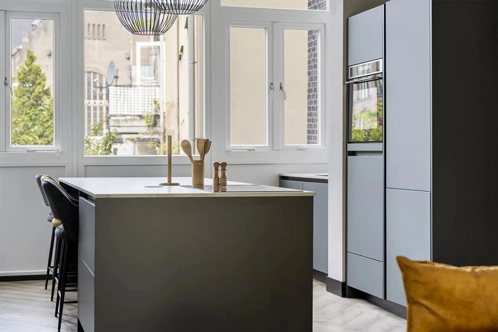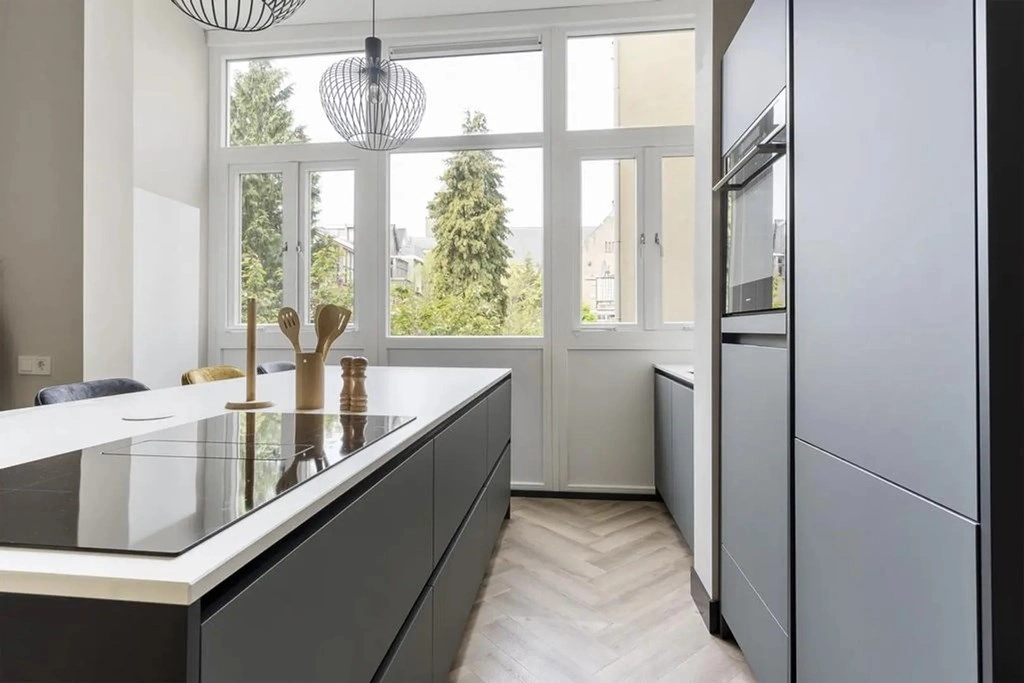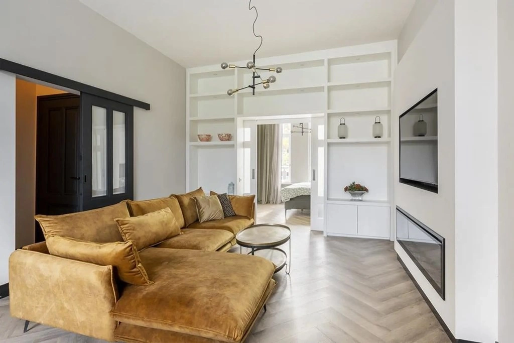 The spacious living room with open kitchen is located at the rear and is nicely furnished. The room features a beautiful herringbone PVC floor, high ceilings and plenty of natural light. An electric fireplace is installed on the wall with a television mounted above it. The modern open kitchen, renewed in 2023, is fitted with matte black cabinetry, a white worktop and a large kitchen island with bar seating. The kitchen is equipped with an induction cooktop with integrated extraction, dishwasher, combination oven-microwave, refrigerator, freezer and tall built-in cabinets.