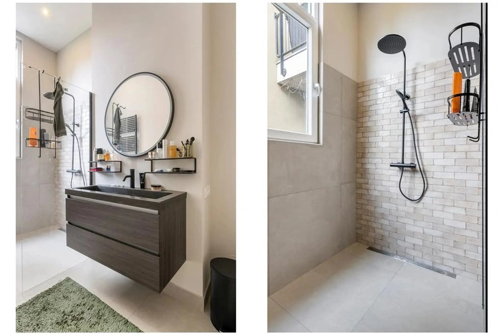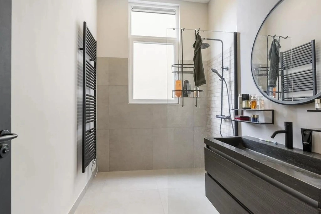 De luxe badkamer aan de achterzijde is eveneens in 2023 volledig vernieuwd en modern afgewerkt. De badkamer beschikt over een ruime inloopdouche met regendouche, een brede wastafel met meubel, ronde spiegel, designkraan en handdoekradiator.
