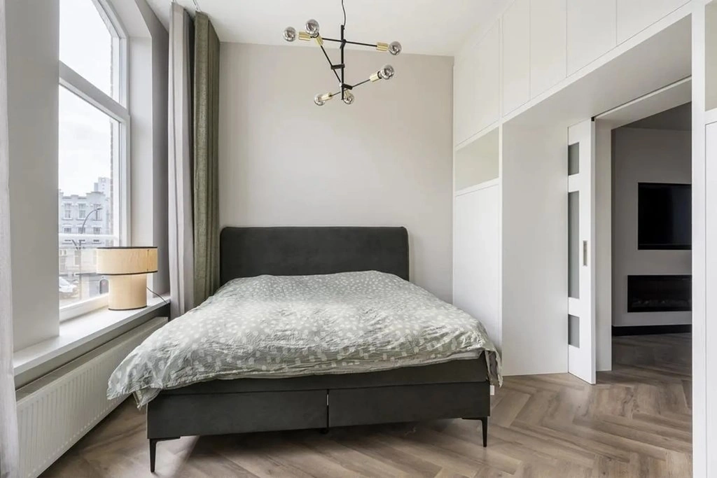 Via en-suite schuifdeuren met inbouwkasten wordt de slaapkamer aan de voorzijde bereikt. Deze kamer is ingericht met een tweepersoonsbed en dressoir en beschikt eveneens over de visgraatvloer en grote raampartijen.