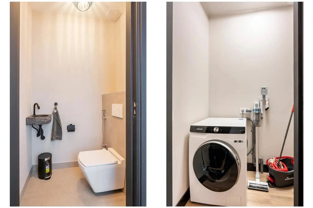 Het separate toilet is uitgevoerd met een hangend closet en fontein en de interne berging biedt ruimte voor wasmachine en opslag.