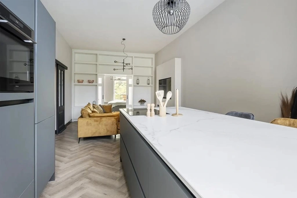 De royale woonkamer met open keuken is gelegen aan de achterzijde en is smaakvol gemeubileerd. De ruimte kenmerkt zich door een fraaie visgraat PVC-vloer, hoge plafonds en veel lichtinval. Aan de wand bevindt zich een elektrische open haard met daarboven een televisie. De moderne open keuken uit 2023 beschikt over matzwarte kasten met een wit werkblad en een ruim kookeiland met barfunctie. De keuken is voorzien van een inductiekookplaat met geïntegreerde afzuiging, vaatwasser, combi oven-magnetron, koelkast, vriezer en hoge inbouwkasten.