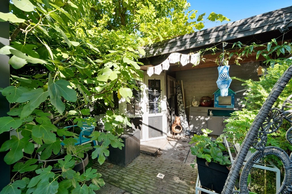 De tuin is voorzien van een pergola, een vrijstaand schuurtje en beschikt over een handige achterom.