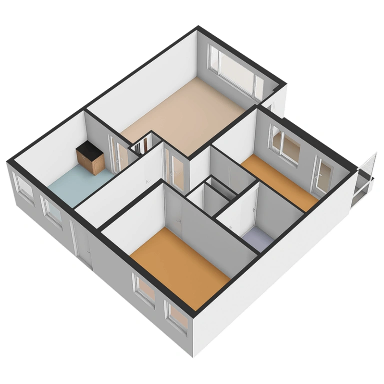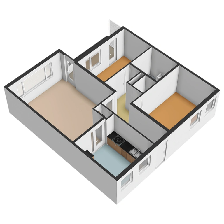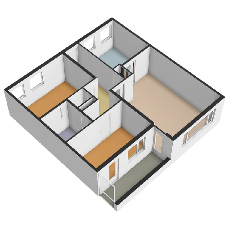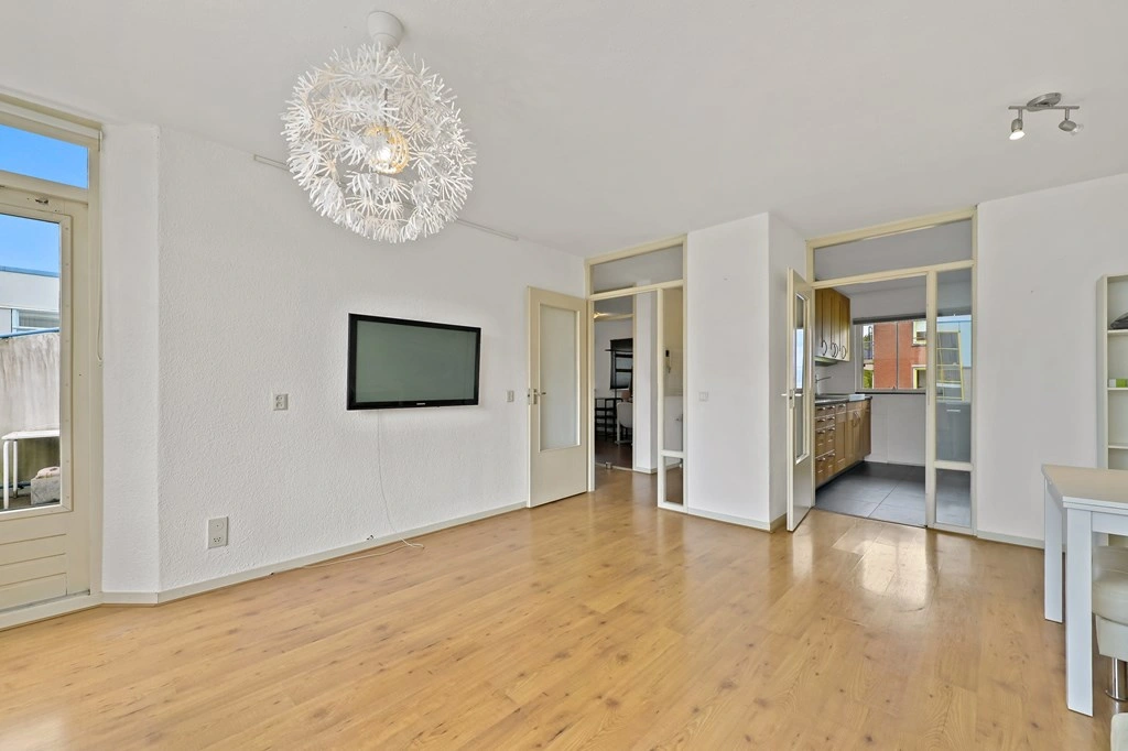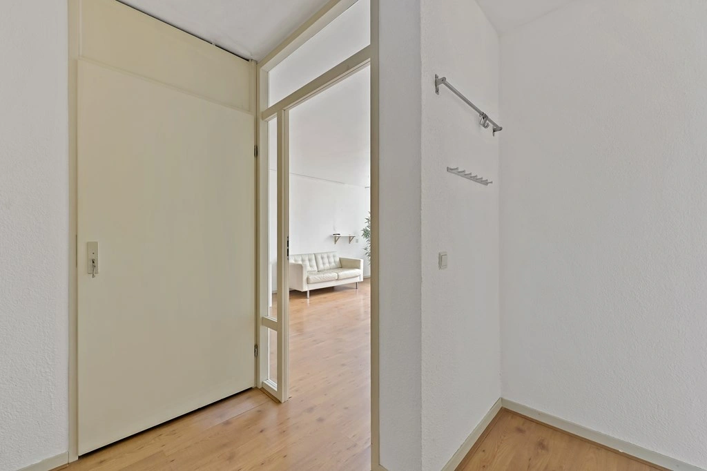 De hal van het appartement biedt toegang tot alle vertrekken. De lichte woonkamer aan de achterzijde is ruim opgezet en heeft grote raampartijen die zorgen voor een prettige lichtinval Vanuit de woonkamer heeft u toegang tot het balkon, gelegen op het zuidwesten, waar u volop kunt genieten van de buitenruimte. Ook is de woonkamer direct verbonden met de keuken.