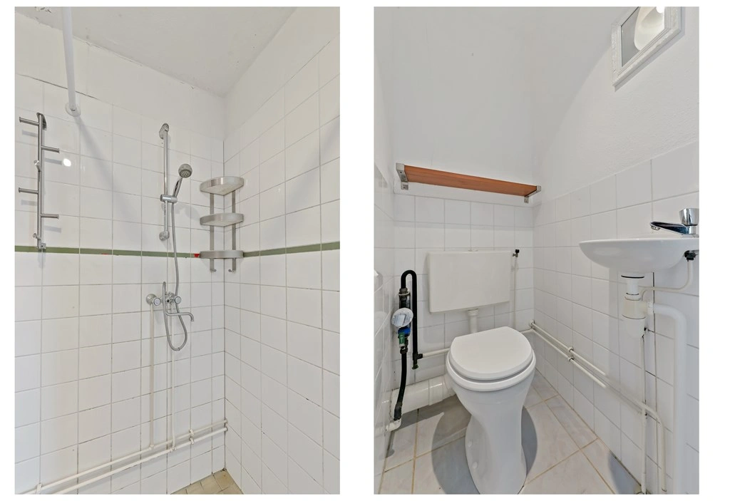 De badkamer is voorzien van een wastafel met meubel, veel opbergruimte en een open douche. Daarnaast is er een separaat toilet aanwezig.