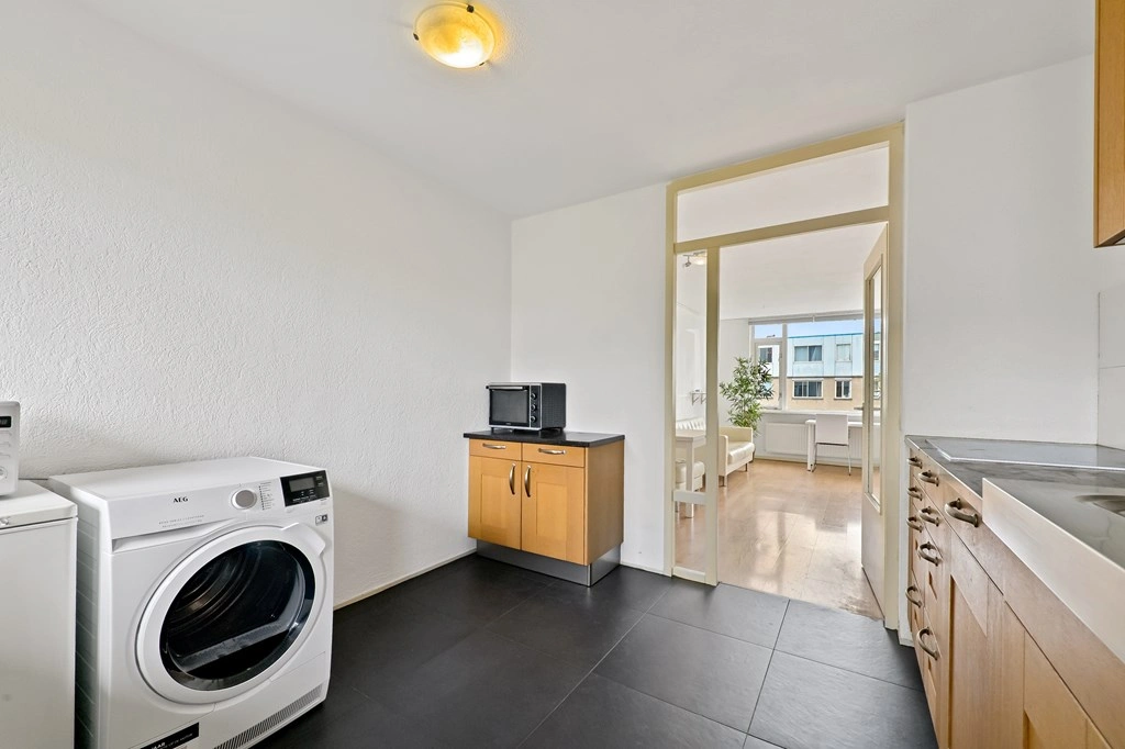 De keuken is uitgevoerd met een net keukenblok in warme houttinten en beschikt over veel bergruimte. Er is ruimte voor diverse (inbouw)apparaten en een aparte kastopstelling met wasmachineaansluiting.