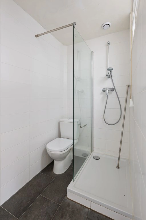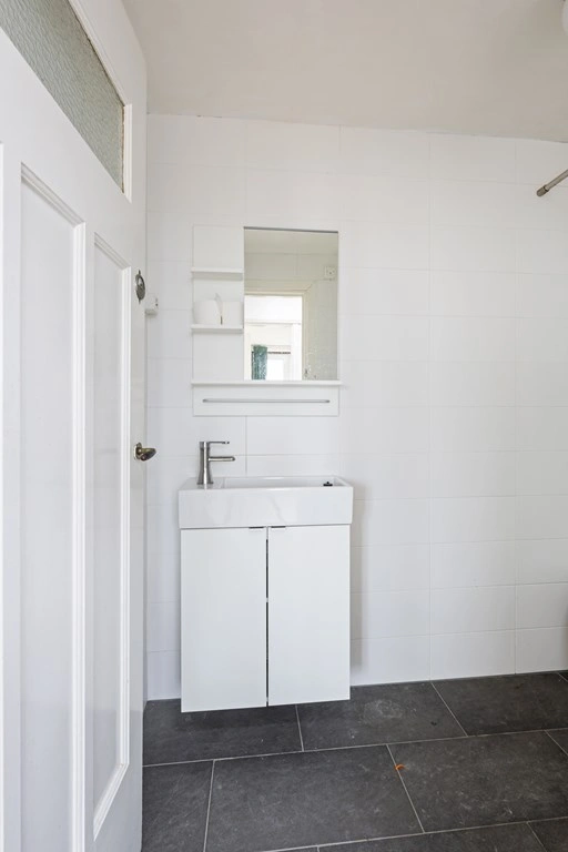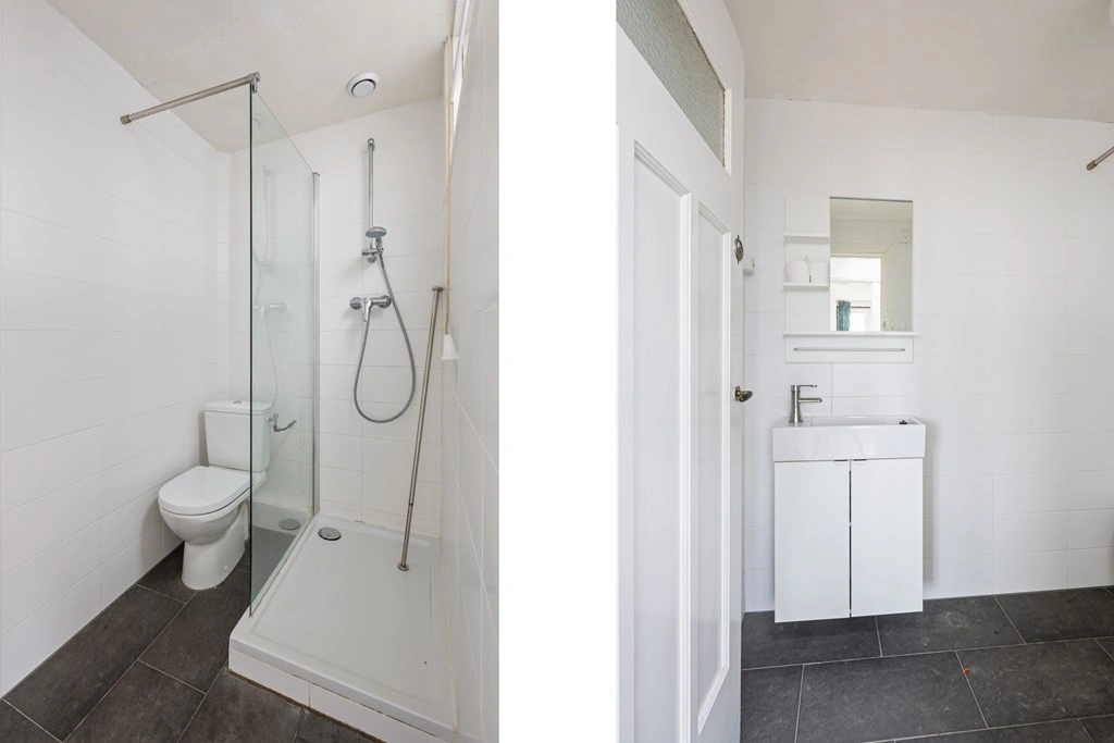 De badkamer is fris afgewerkt met witte wandtegels en een donkere tegelvloer. Je vindt hier een inloopdouche, een wastafelmeubel met spiegel, een tweede toilet en natuurlijk daglicht dankzij een hoog geplaatst raam.