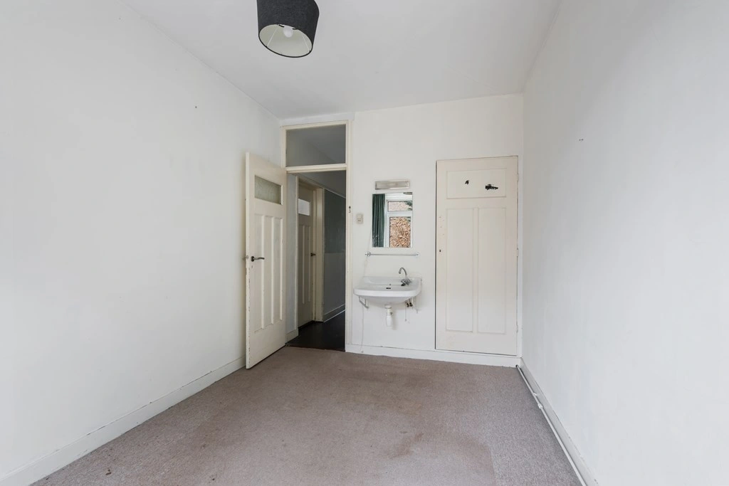 The kitchen is located at the front and is simply but functionally equipped with a gas hob, extractor hood, sink and ample cupboard space. With some creativity, this space can easily be transformed into a modern and efficient kitchen-diner.