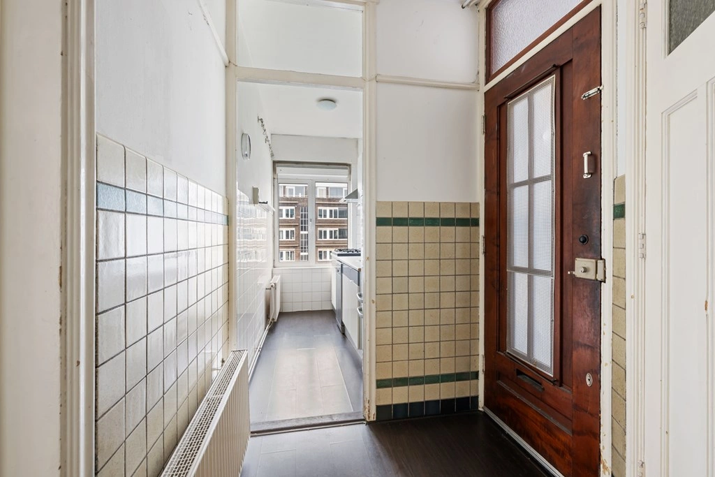 Je betreedt de woning op de tweede verdieping via een karakteristieke entree met originele wandtegels. Vanuit de hal heb je toegang tot het separate toilet, de dichte keuken en de trap naar de bovenliggende woonlagen.