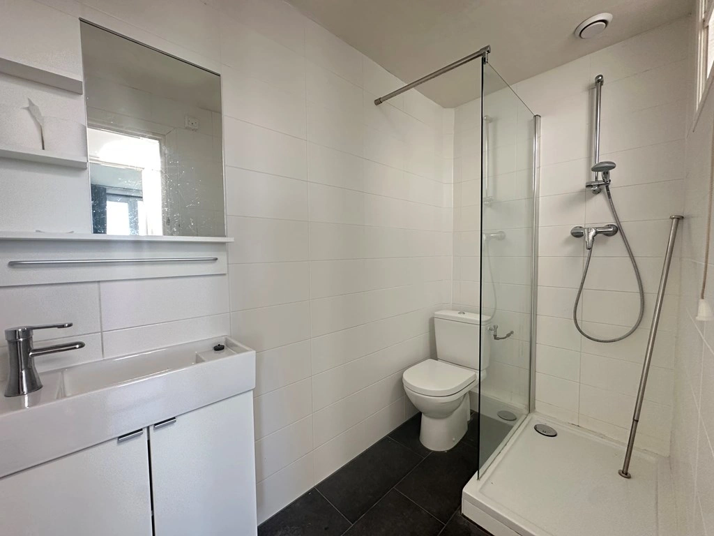 The bathroom is neatly finished with white wall tiles and a dark tiled floor. It features a walk-in shower, a vanity unit with mirror, a second toilet and natural daylight via a high-level window.