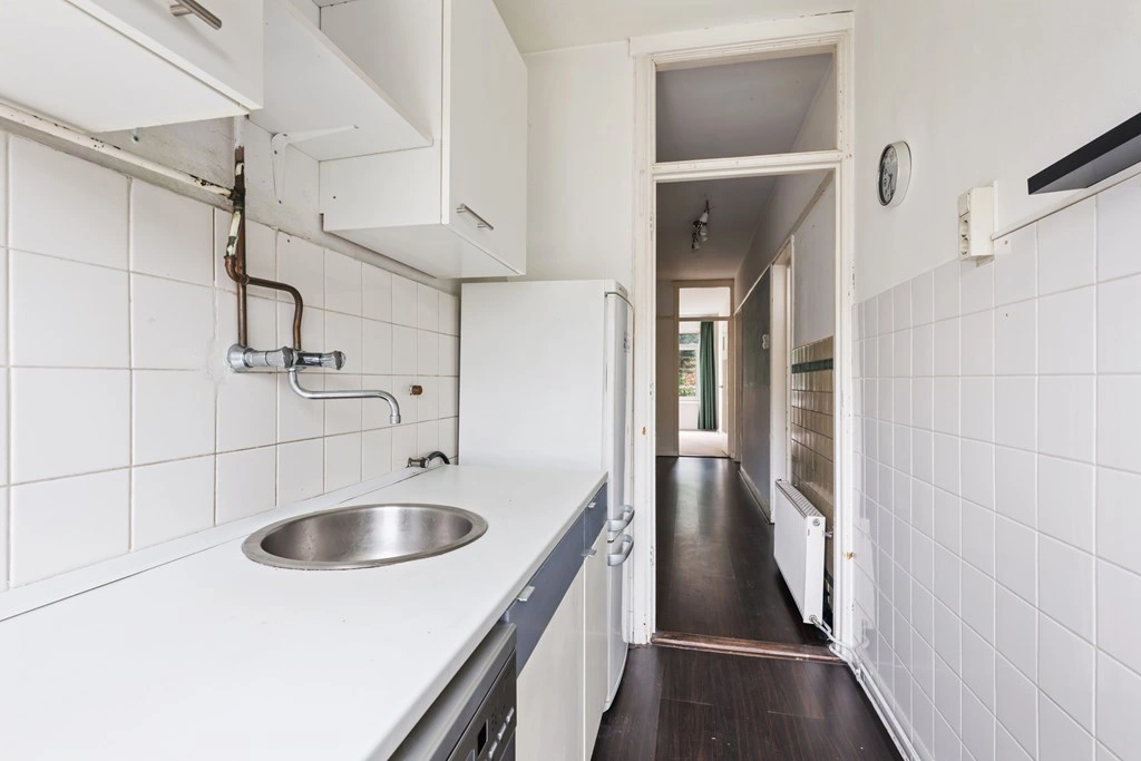 De keuken ligt aan de voorzijde en is eenvoudig ingericht, maar functioneel opgezet met gaskookplaat, afzuigkap, spoelbak en voldoende kastruimte. Met wat creativiteit tover je deze ruimte om tot een moderne, efficiënte woonkeuken.