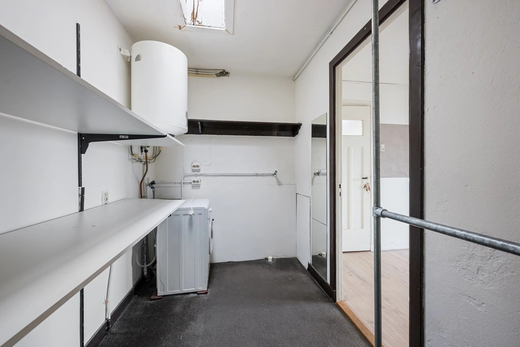 Aangrenzend aan de grootste slaapkamer bevindt zich een praktische technische ruimte/berging met aansluiting voor de wasmachine, voldoende werkblad en bergruimte, én de opstelling van de elektrische boiler. Dankzij het dakraam komt ook hier prettig daglicht naar binnen.