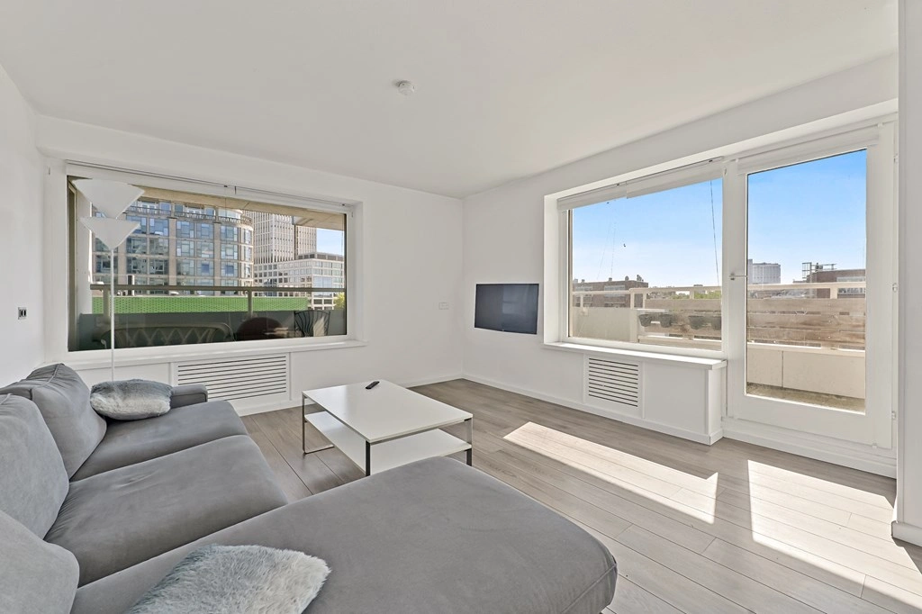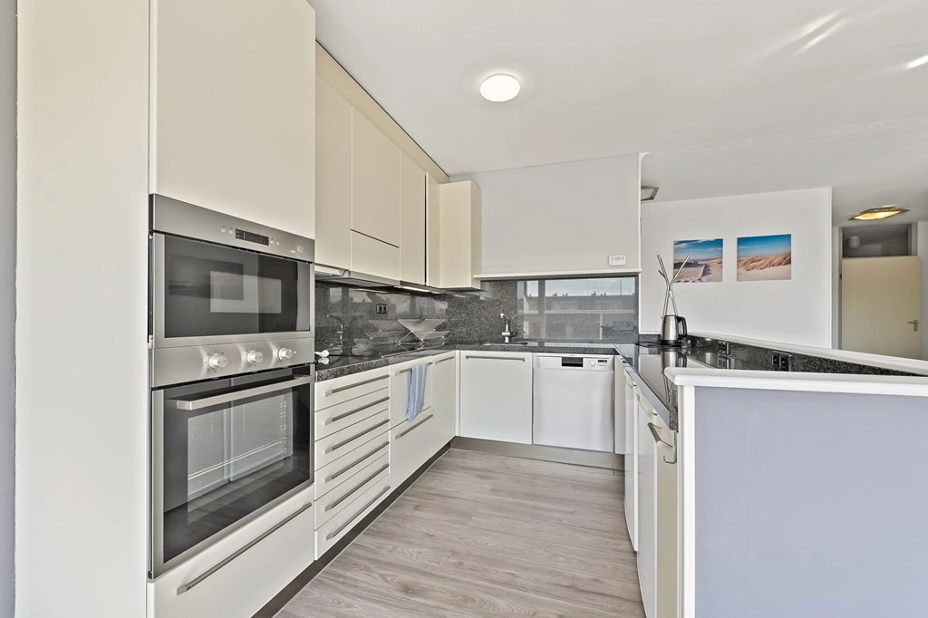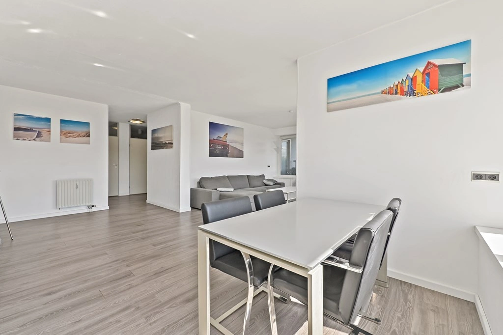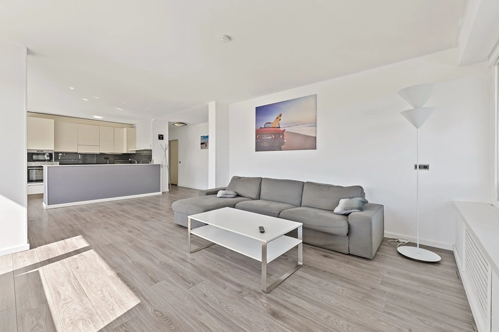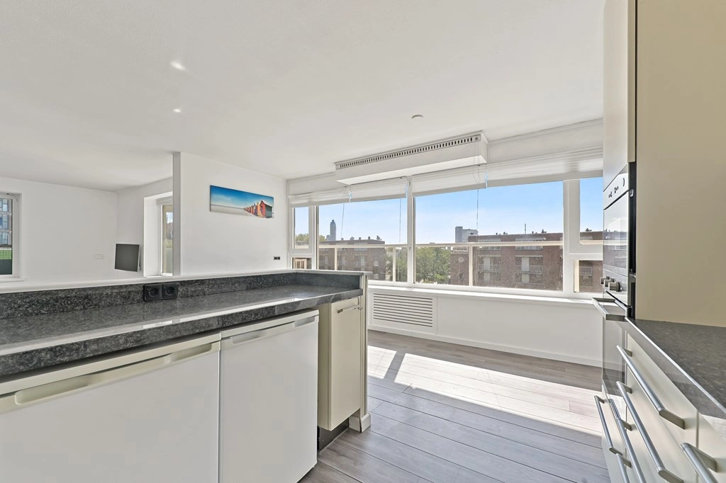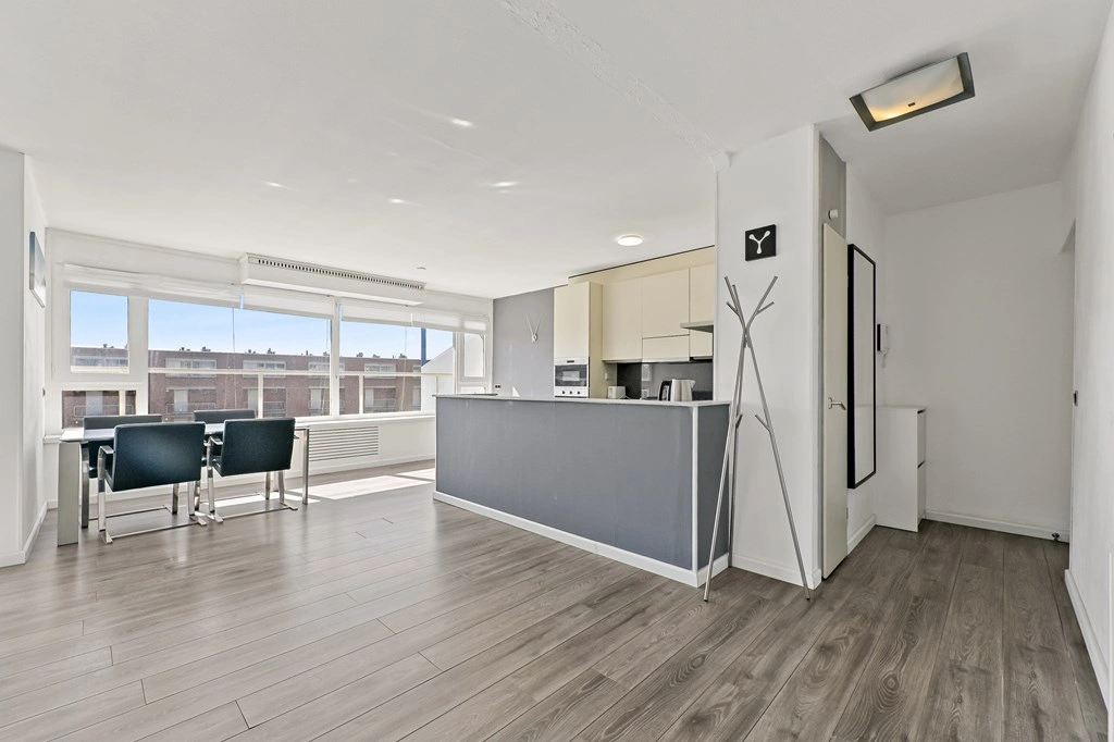 De hal geeft directe toegang tot de ruime en open woonkamer. Deze open ruimte is bijzonder licht dankzij de grote raampartijen en heeft een prettige indeling met een duidelijk onderscheid tussen een zitgedeelte en een eetgedeelte. De woonkamer staat in open verbinding met de keuken, waardoor er een fijne leefruimte ontstaat waar koken, eten en ontspannen naadloos in elkaar overlopen. Vanuit de woonkamer is er toegang tot het royale balkon, een heerlijke plek om buiten te zitten en te genieten van het uitzicht over de stad.