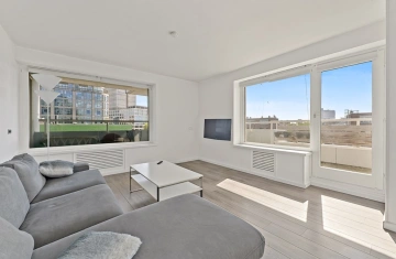 The hallway leads directly into the generous and open-plan living room. This bright space benefits from large windows and has a practical layout with a natural separation between the sitting area and dining area. The living room is directly connected to the kitchen, creating a pleasant open living space where cooking, dining and relaxing flow together seamlessly. From the living room there is access to the large balcony – a wonderful place to sit outside and enjoy the city views.