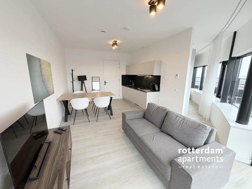 Volledig gemeubileerde studio met prachtig uitzicht, gelegen aan de Rivium 1e Straat in de moderne Rive Tower.