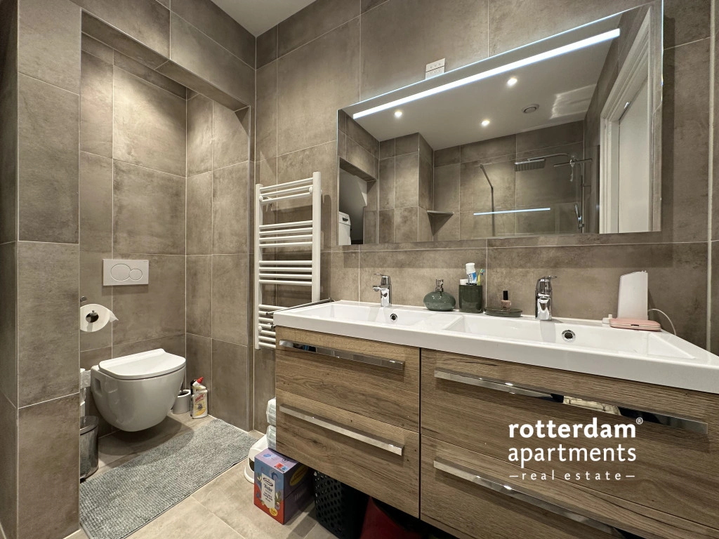De moderne badkamer is geheel betegeld en beschikt over een inloopdouche met glazen wand, een toilet, een dubbele wastafel met spiegelkast, en een wasmachine en droger.