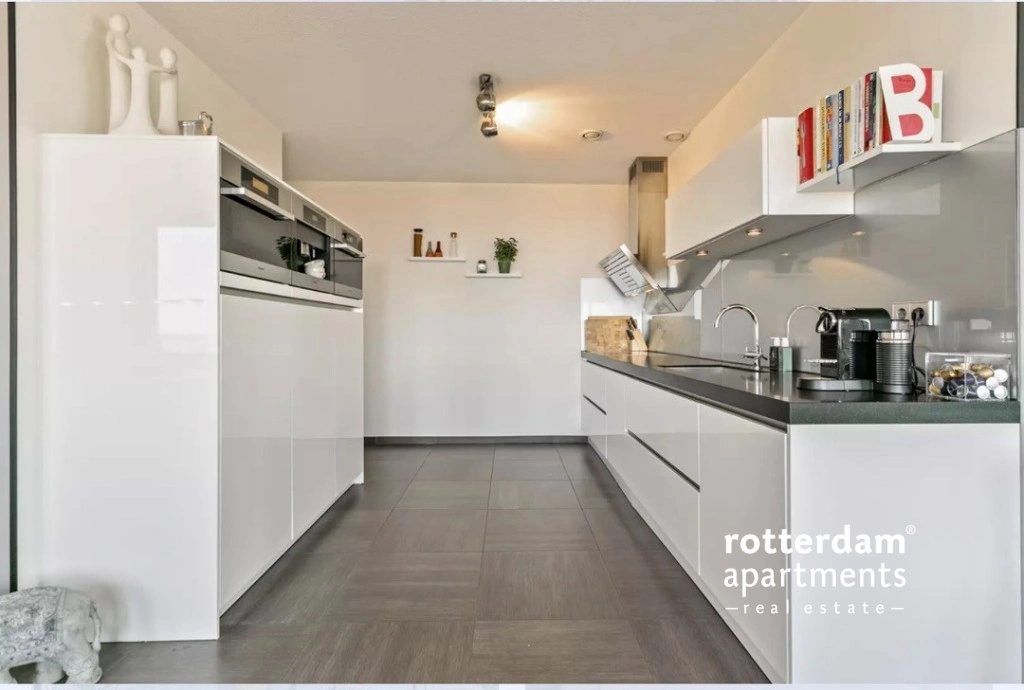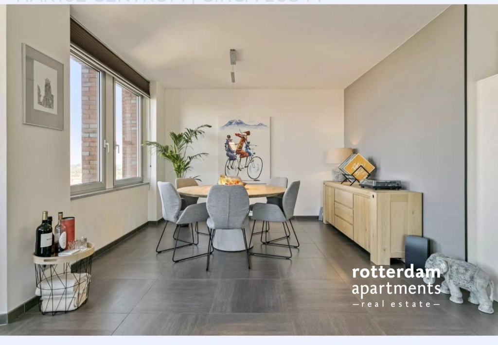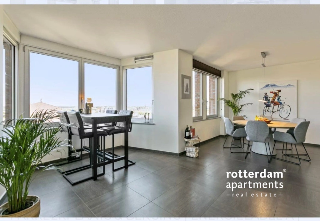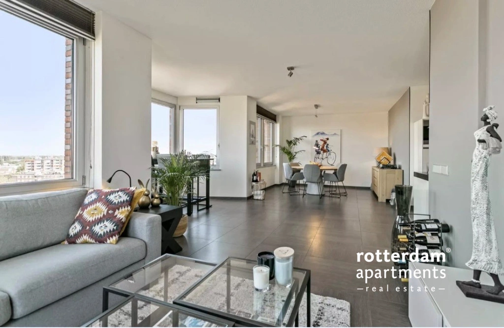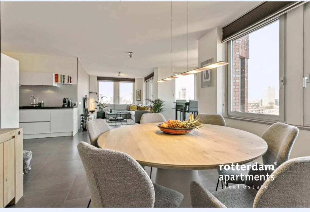 Via de keuken bereik je de royale woonkamer is bijzonder licht dankzij de grote raampartijen en biedt een indrukwekkend uitzicht over de skyline van Rotterdam. De ruimte is modern ingericht en heeft een strakke, luxe uitstraling met een nette tegelvloer en neutrale wandafwerking. De woonkamer is verdeeld met een comfortabele zithoek, een ruime eethoek en de keuken.
