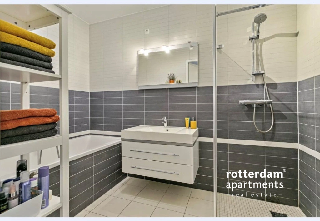 De badkamer is uitgevoerd met een combinatie van grijze en witte tegels en beschikt over een ligbad, inloopdouche en wastafelmeubel. Verder is er een separaat is er een toilet aanwezig en een praktische berging met wasmachineaansluiting.
