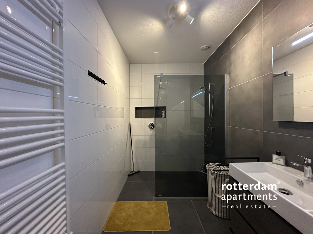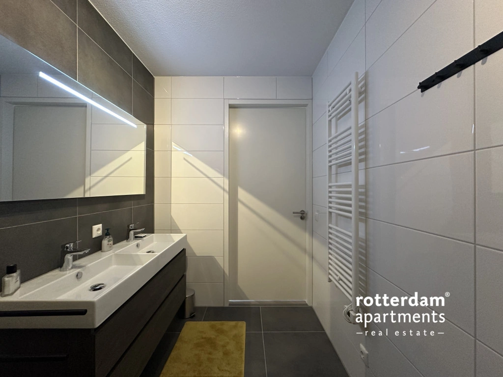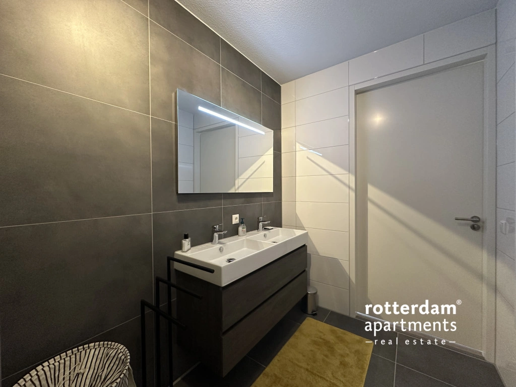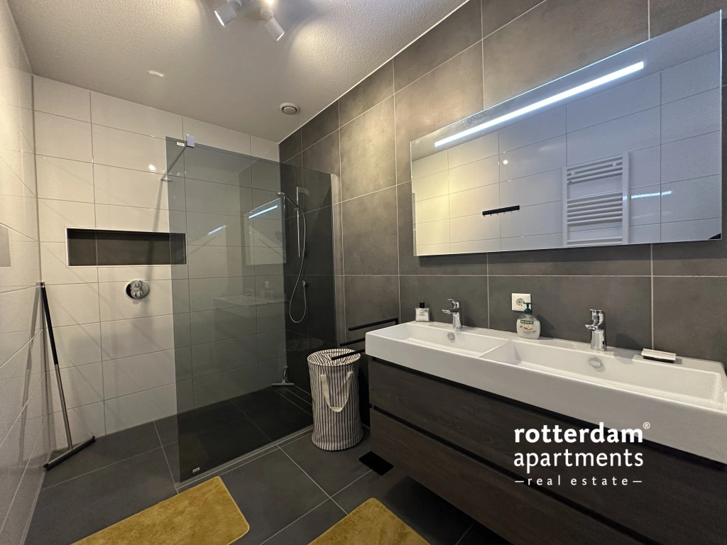 De badkamer is modern en voorzien van een ruime inloopdouche, dubbele wastafel met spiegelkast en strak tegelwerk.