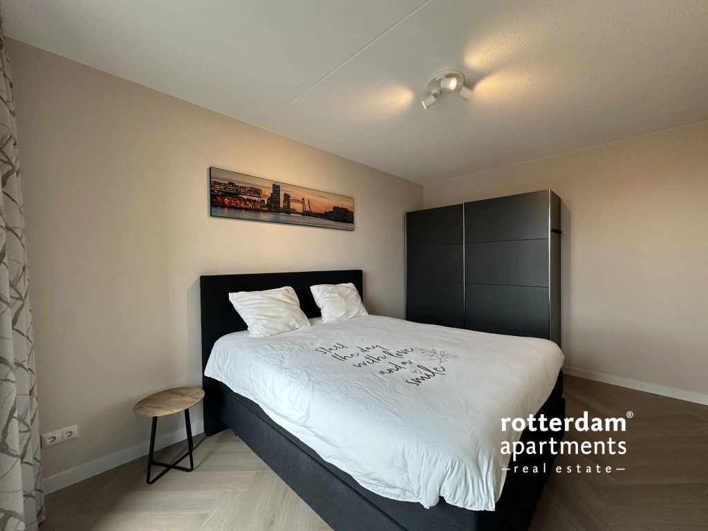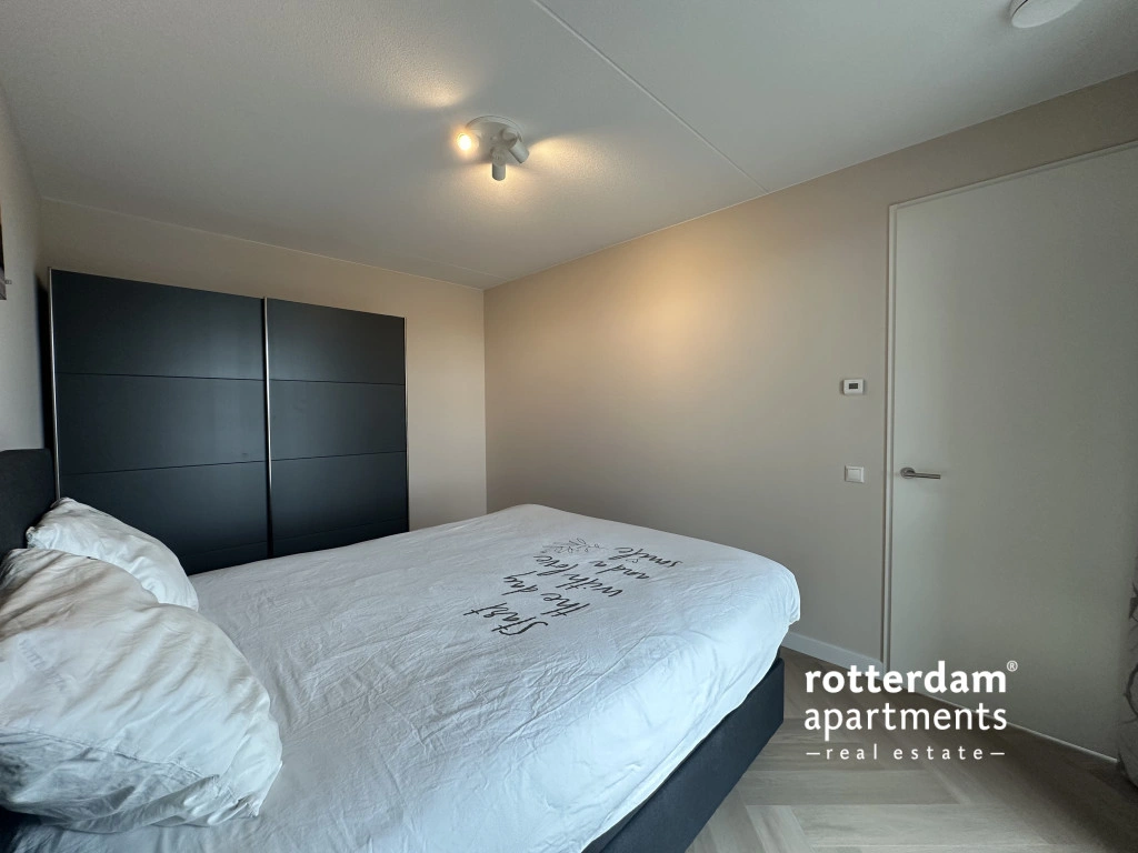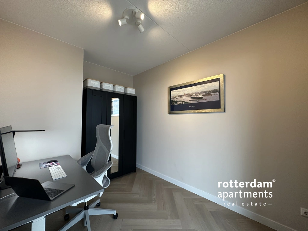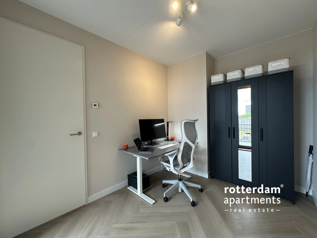 De hoofdslaapkamer beschikt over een luxe boxspring (tweepersoonsbed), twee nachtkastjes en een ruime kledingkast. De tweede slaapkamer is momenteel ingericht als werkkamer met een strak bureau, ergonomische bureaustoel, garderobekast en veel daglicht – ideaal voor thuiswerken.